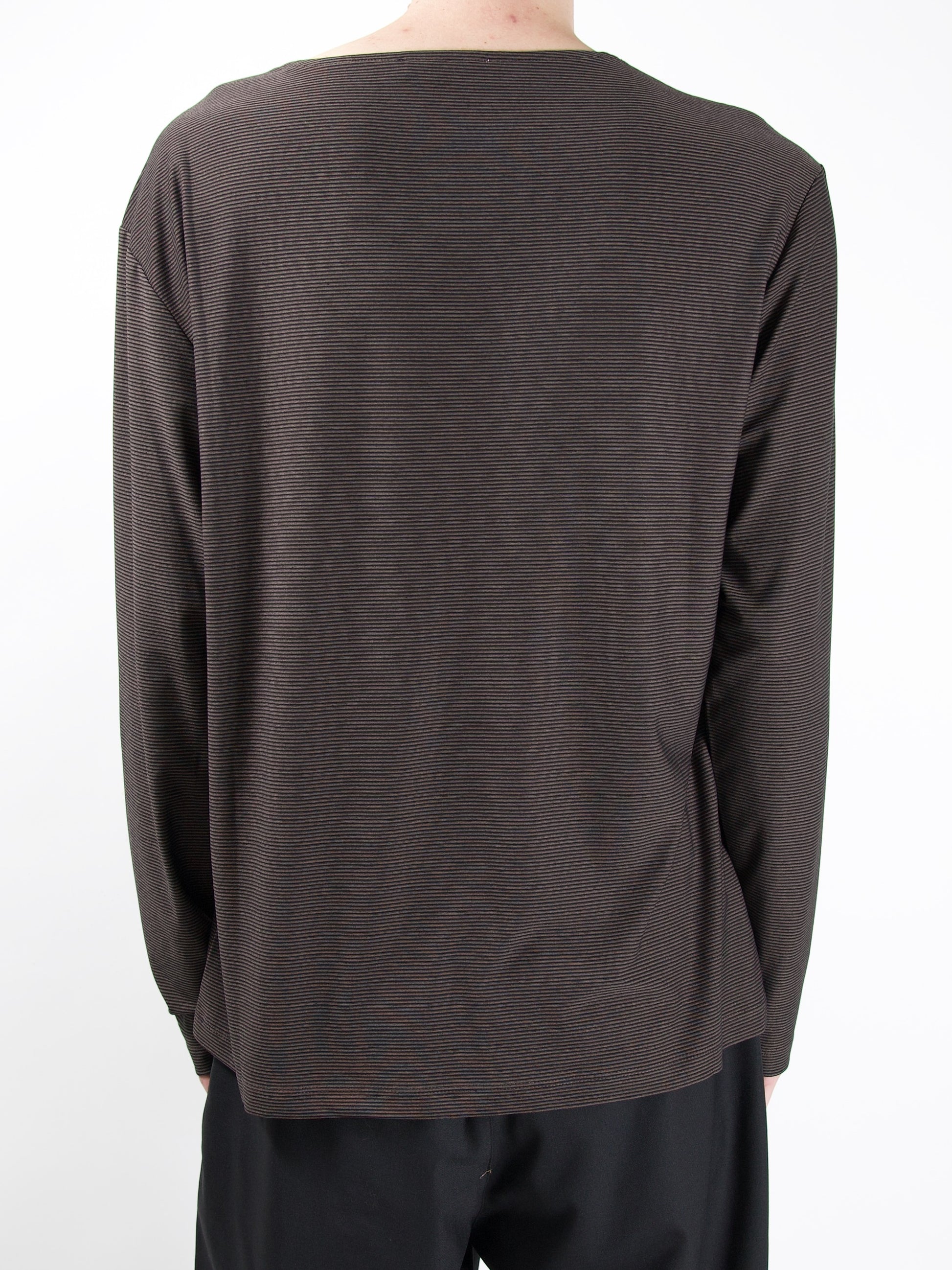 ストライプパターンが印象的なボートネックのロングスリーブTシャツ。
