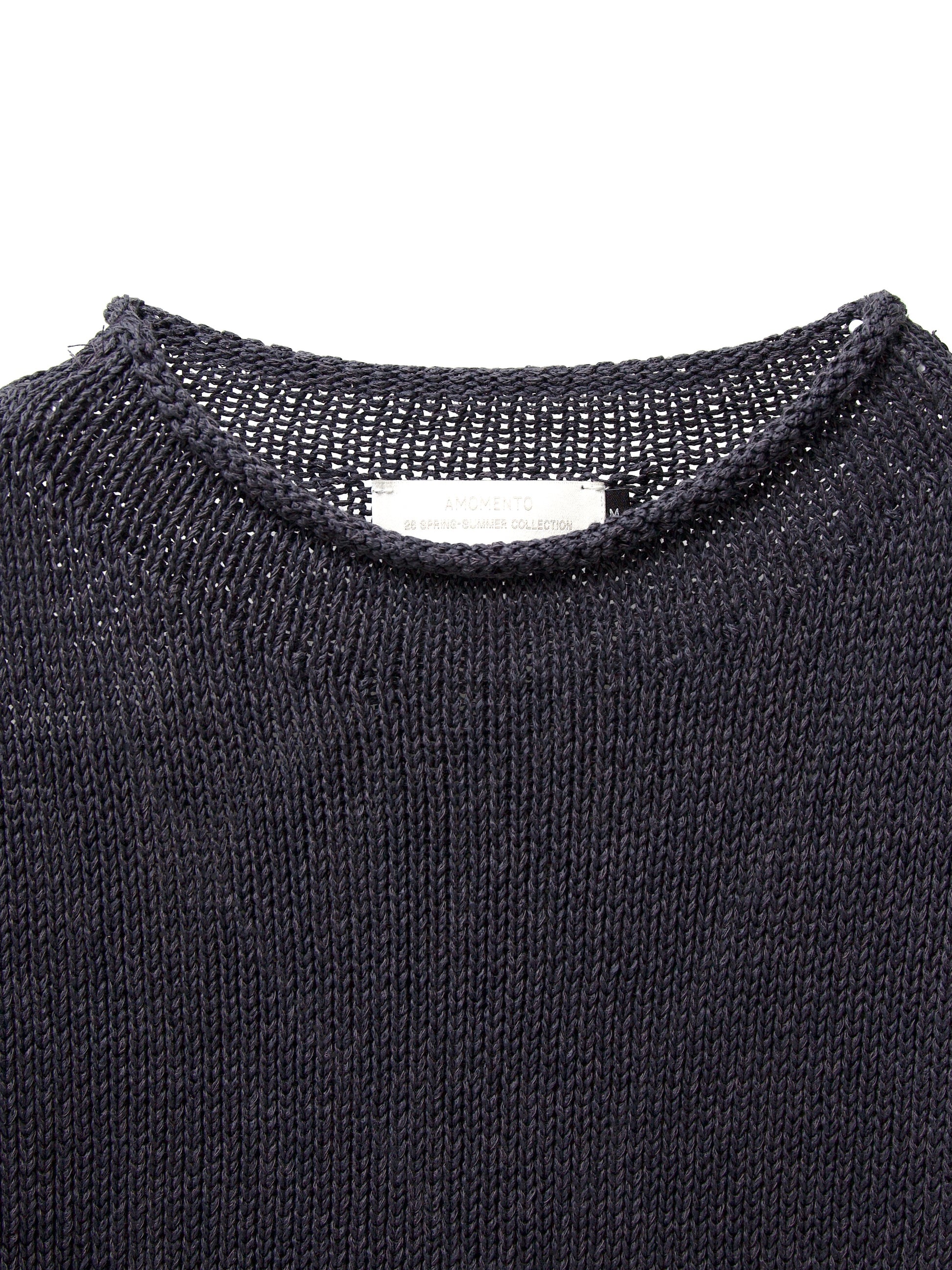 切りっぱなしのディテールがナチュラルなムードを引き立て、後身頃中央には編み組織の変化をさりげなく取り入れることで、控えめながらも奥行きのあるアクセントに。
