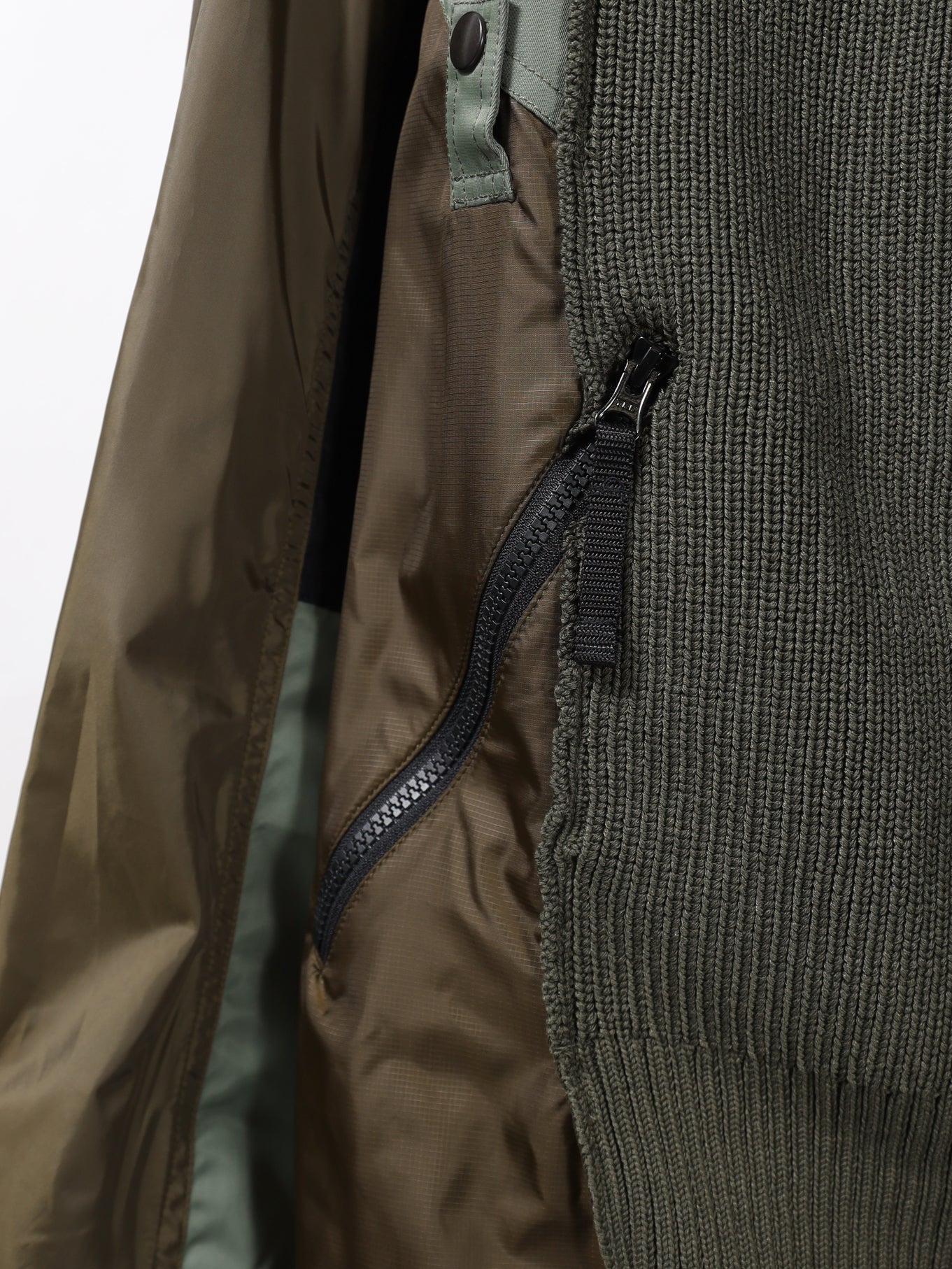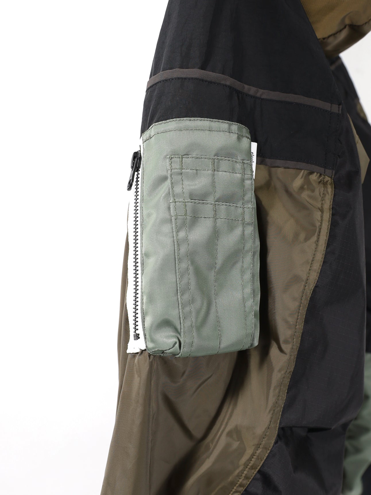 ただ切り替えるのではなく、折り重なるように合わせ、複雑でより立体的な見え方になる様パターンメイク。 首元はニットかぶれがおきないポリエステル100%の糸で構成したニットパーツを配置。 総裏仕様。裏地にはソフトな肌触りが特徴の吸汗速乾機能のあるメッシュ生地を使用。 フードはスナップボタンにて取り外し可能のデタッチャブル仕様。 フロントには大振りなファスナーポケット2ヶ所、ユーティリティポケット1ヶ所。 裾部分にはアジャスター付きドローコードを配置し、シルエット変更が可能。