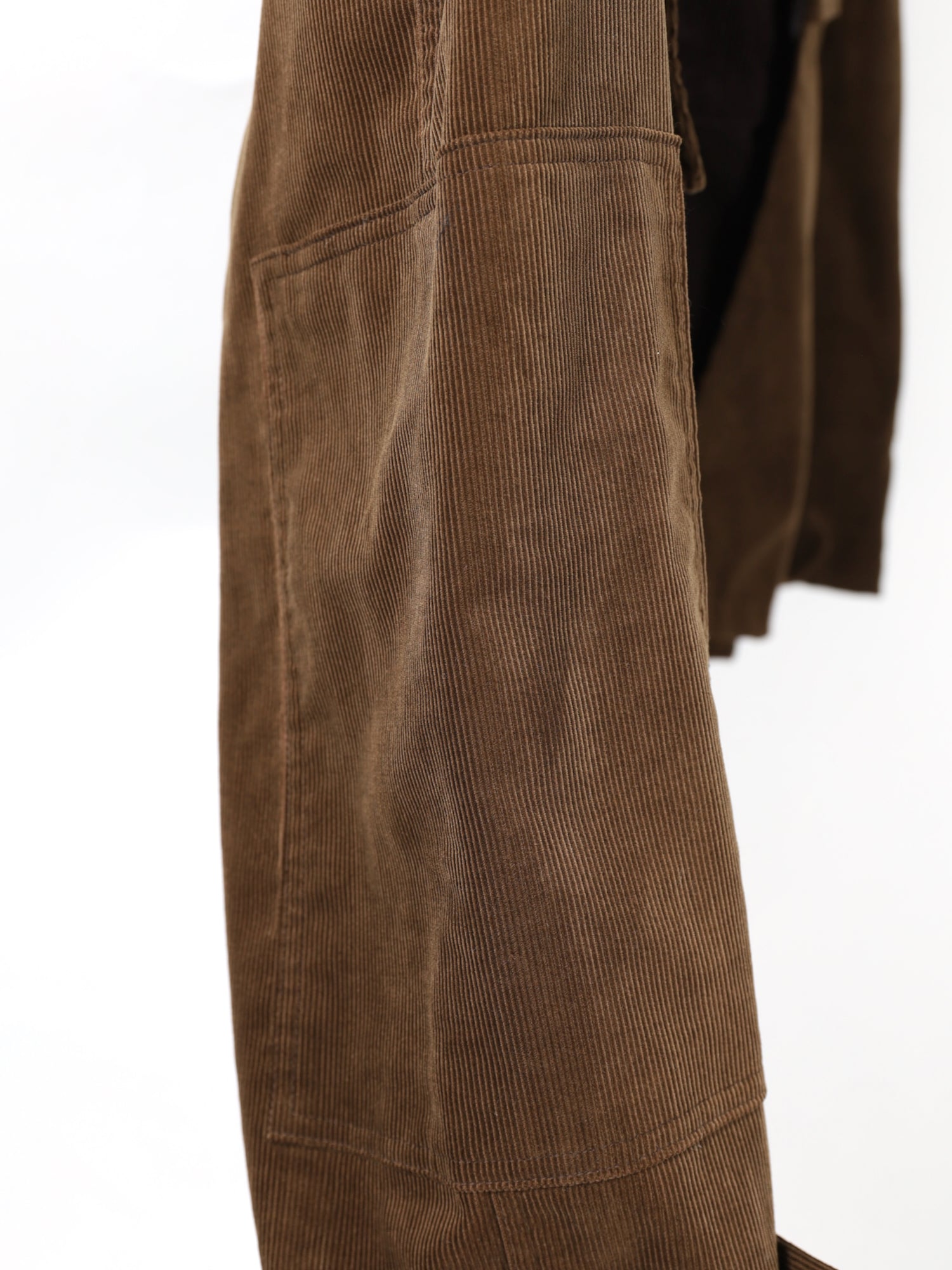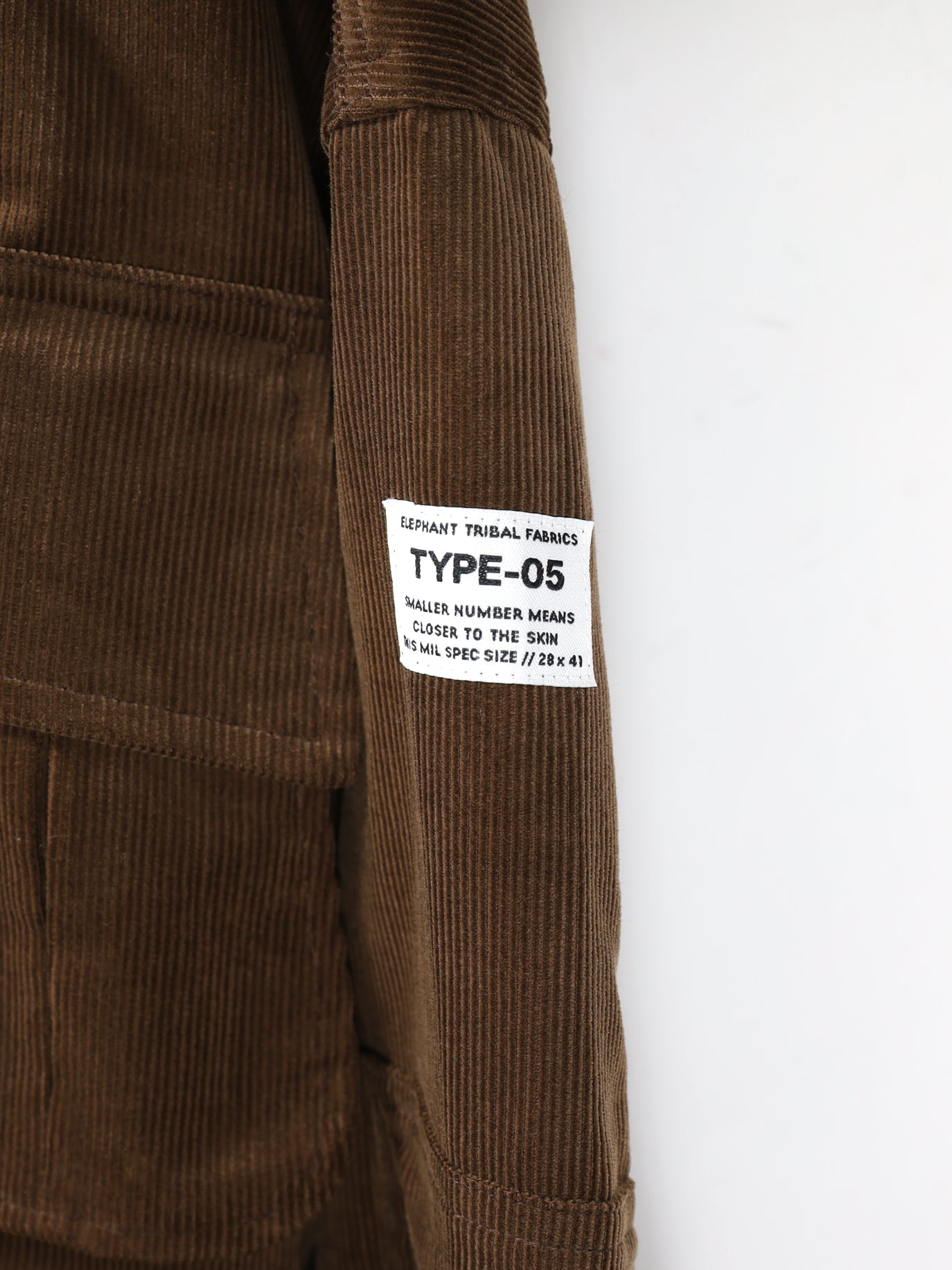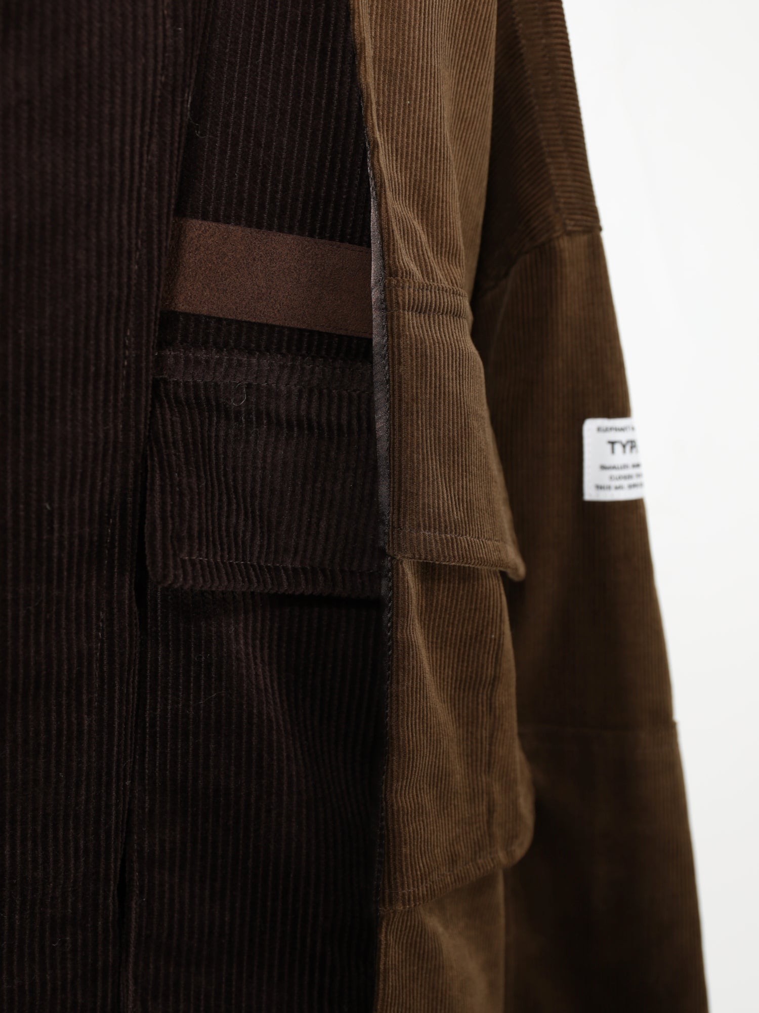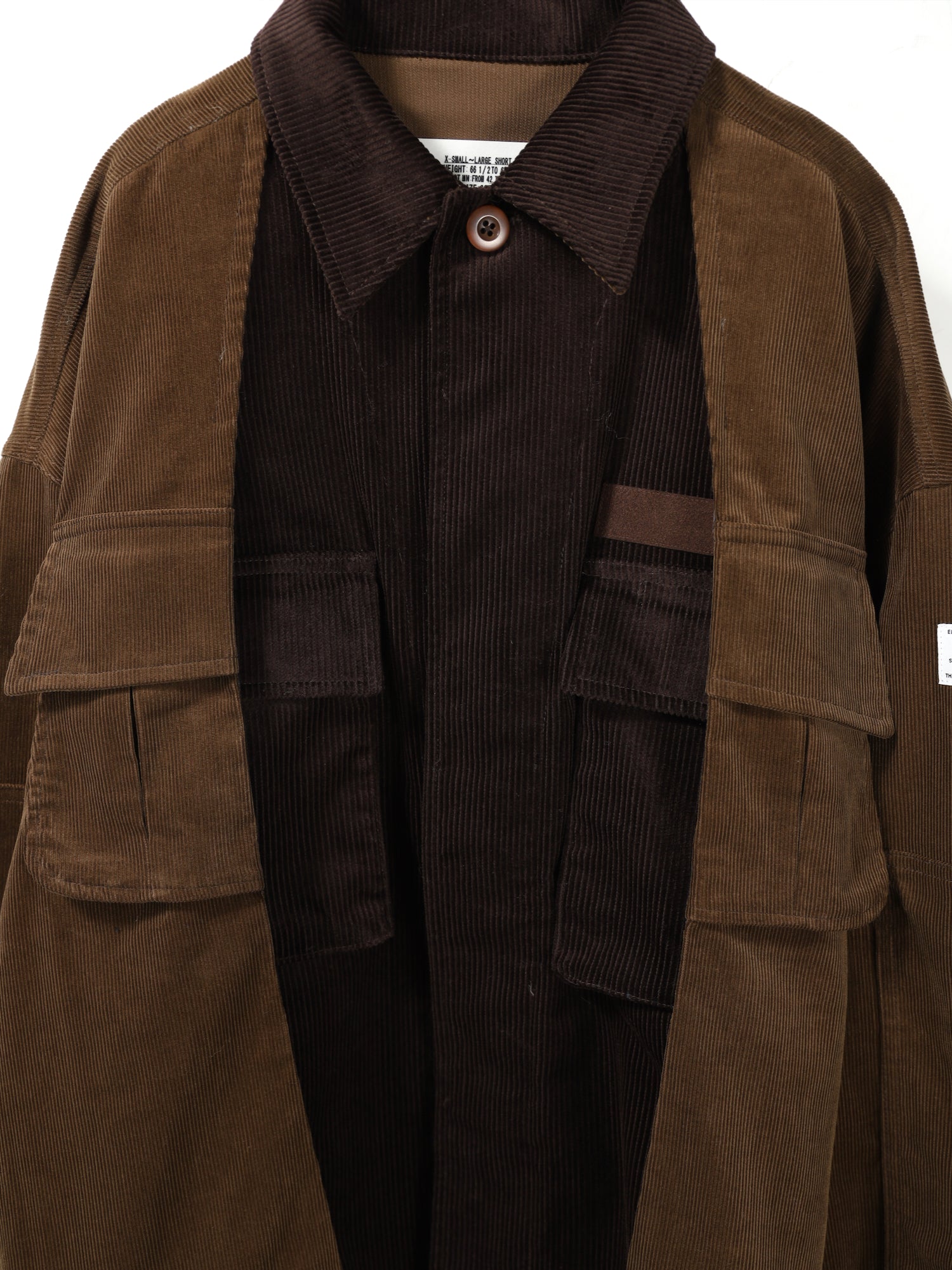ただ切り替えるのではなく、折り重なるように2着を合わせ、複雑でより立体的な見え方になる様パターンメイク。 内側のBDUシャツ部分は8Wの太畝コーデュロイを使用し、外側のファティーグシャツ部分は14Wの細畝コーデュロイを使用。 胸ポケット(内側のBDUシャツ部分)2ヶ所、サイド部分にスラッシュポケット2ヶ所を配置。 裾部分にはアジャスター付きドローコードを配置し、シルエット変更が可能。