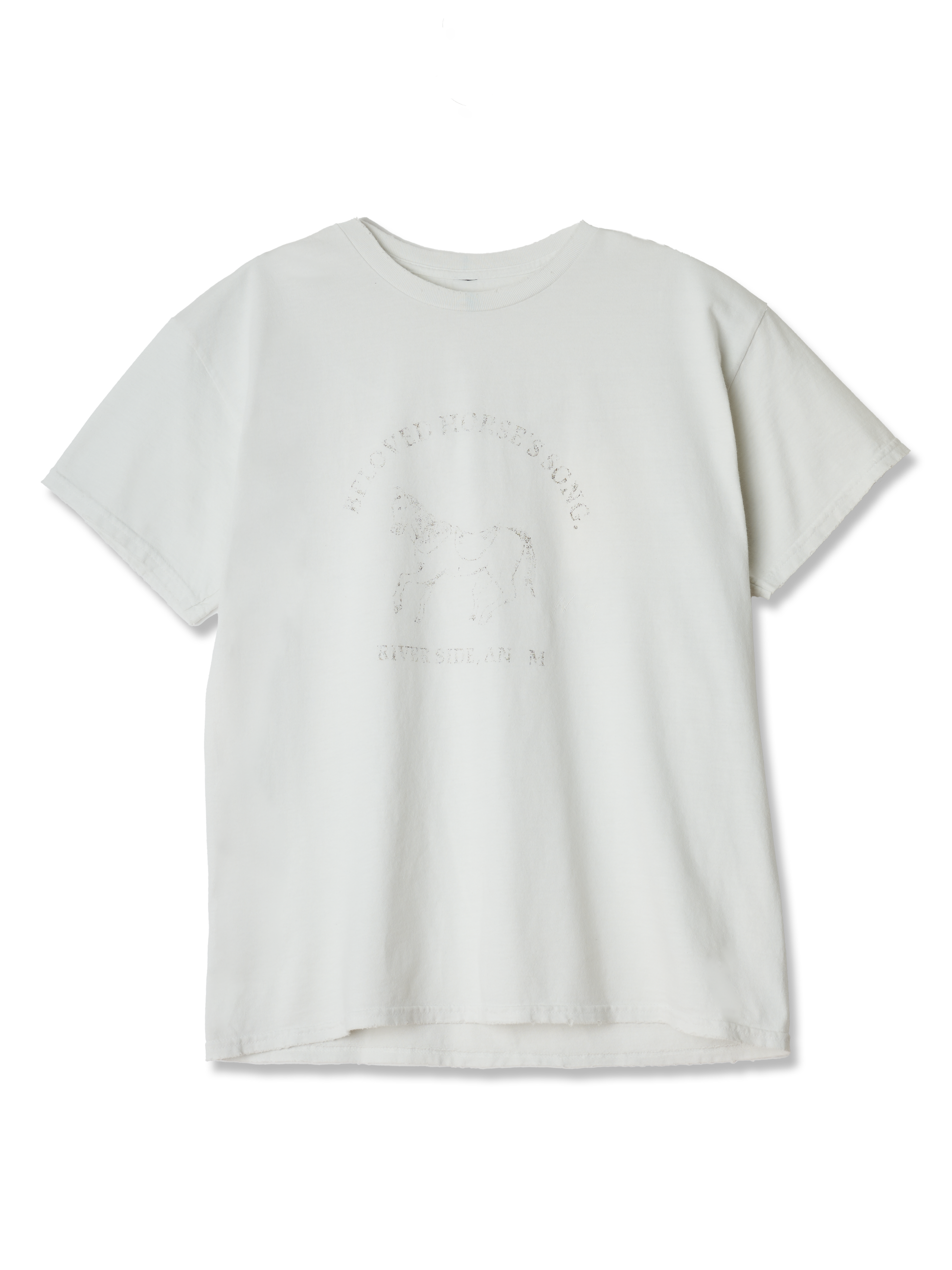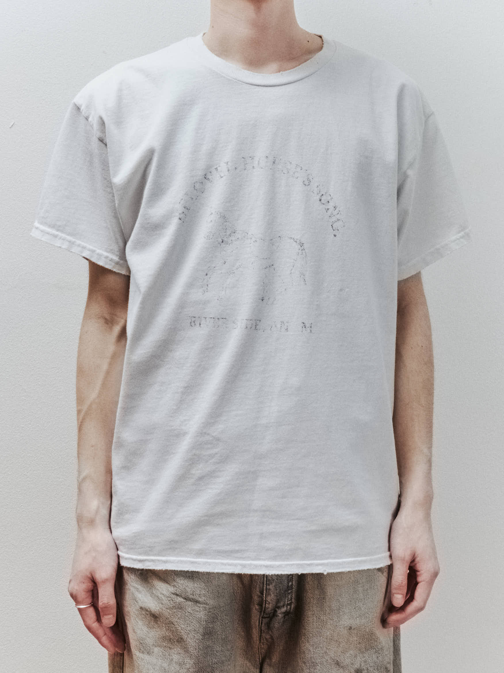 着古したように掠れた風合いでプリントを載せ、染色と加工でグラフィックを馴染ませる。