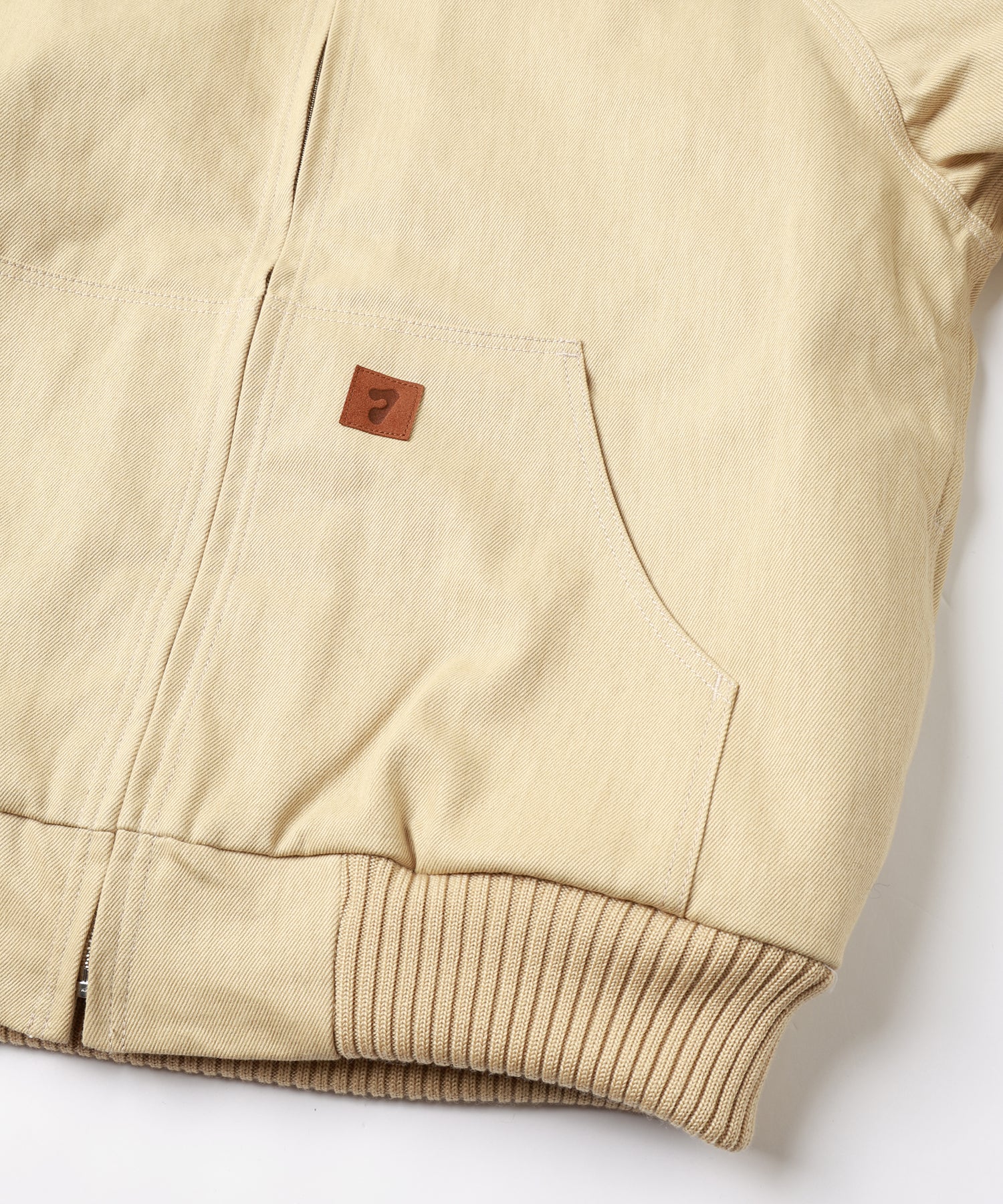 フロントには大きめのハンドポケット、オリジナルレザーパッチがさりげないアクセントとなっています。