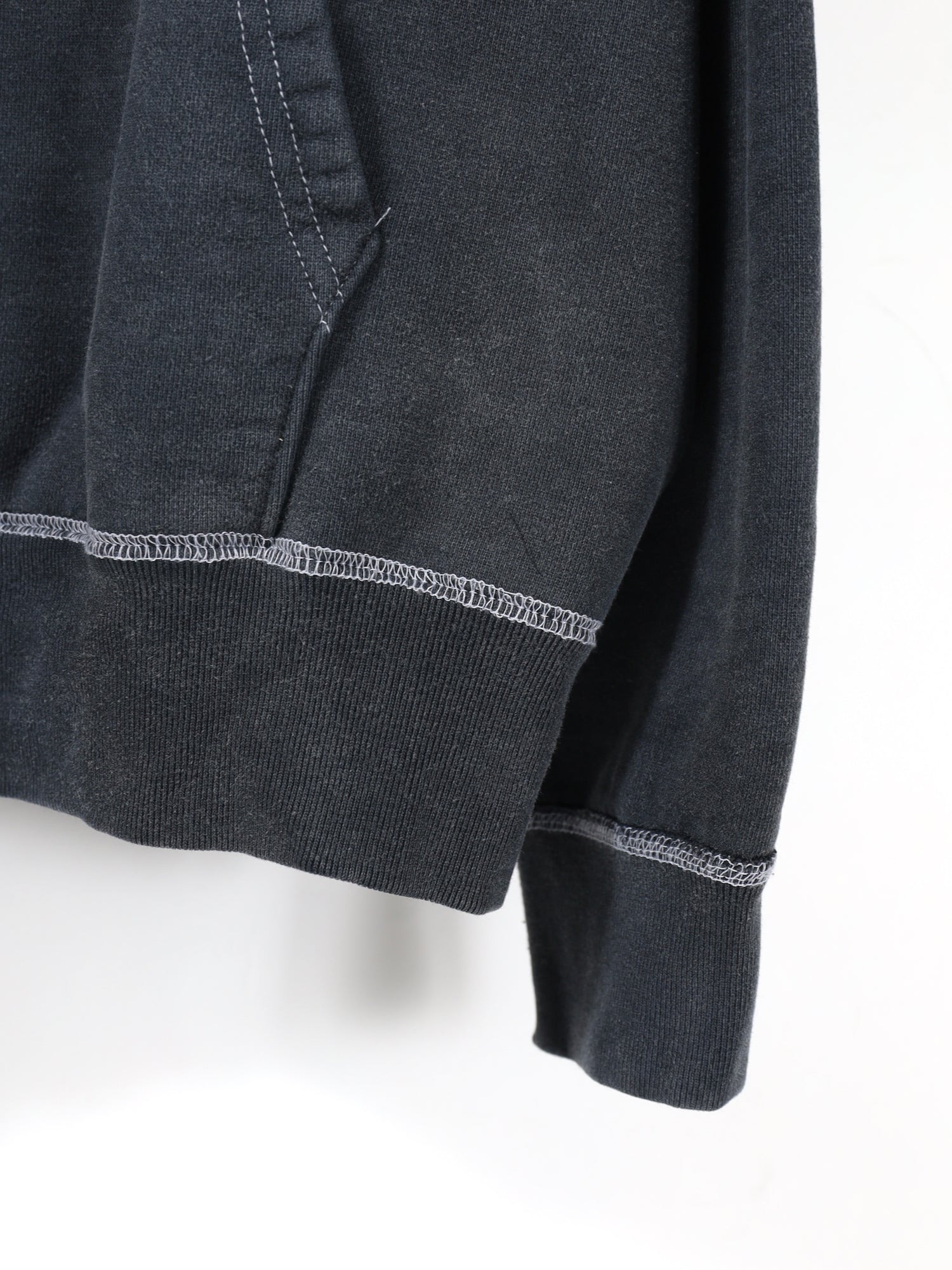 クイックに着用出来るよう、フロント部分にはスナップボタンを1ヶ所配置。 製品後、硫化染めを施し更にブリーチをナノサイズにしたミストで追い加工を施した細かなフェード感のあるアイテム。