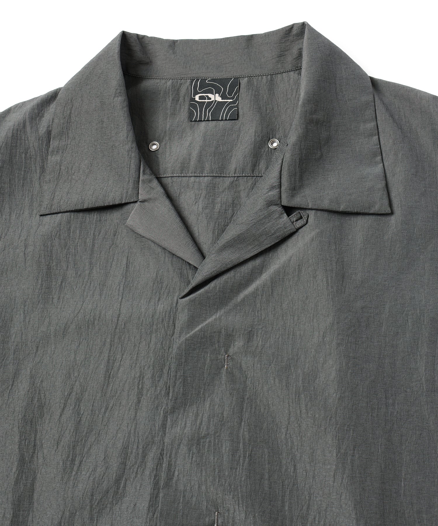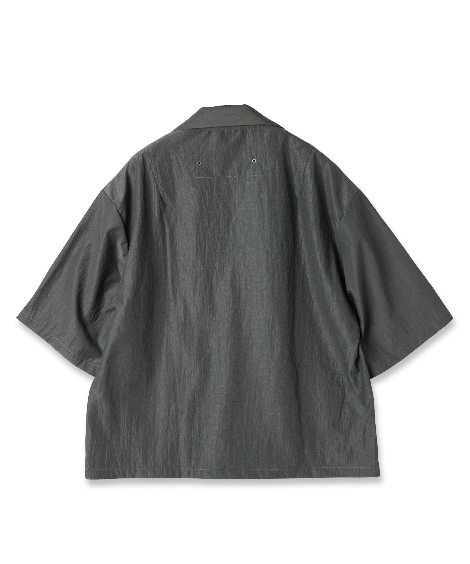 KAJIFUのナイロン素材を使用したオープンカラーショートスリーブシャツ。