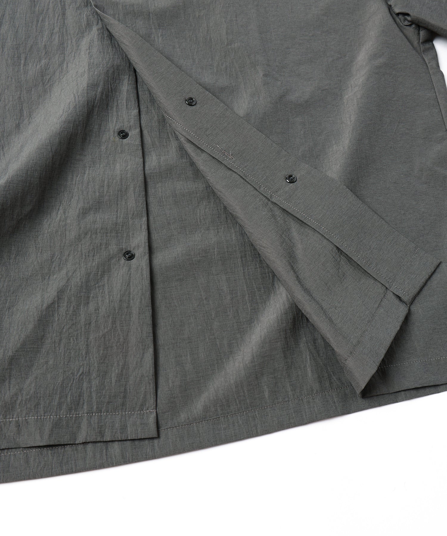フロントの前開きは隠しドットボタンを採用。襟元のボタンで通常のシャツの様にも着れるフレキシブルな襟となっております。