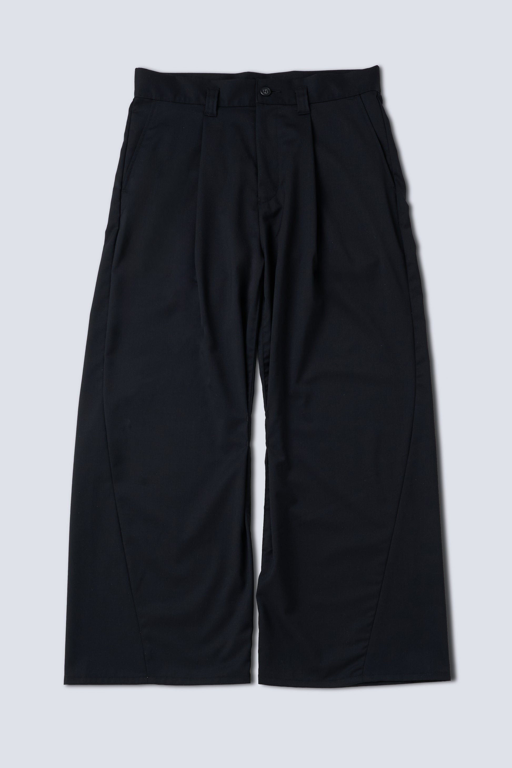 インシームにタックを入れることで立体感を生み出し、サイドシームをやや前振りに設計することで、上品さの中にさりげない違和感を加えたデザインが特徴です。