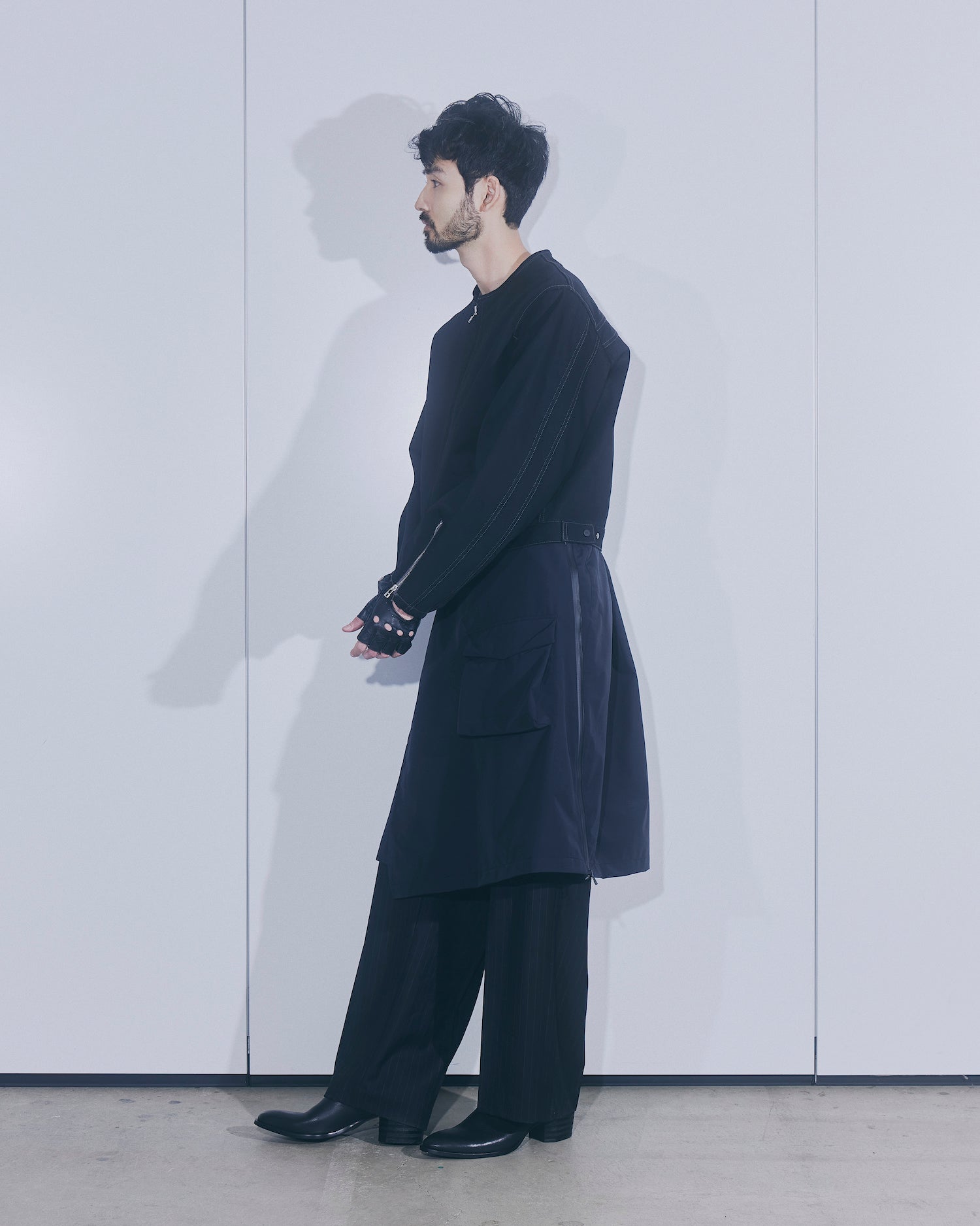 前面はミニマルなデザインに仕上げ、背面には2重のバック切り替えを施して無骨な印象に落とし込んでいる。素材には厚みのある 13ozデニムを採用。