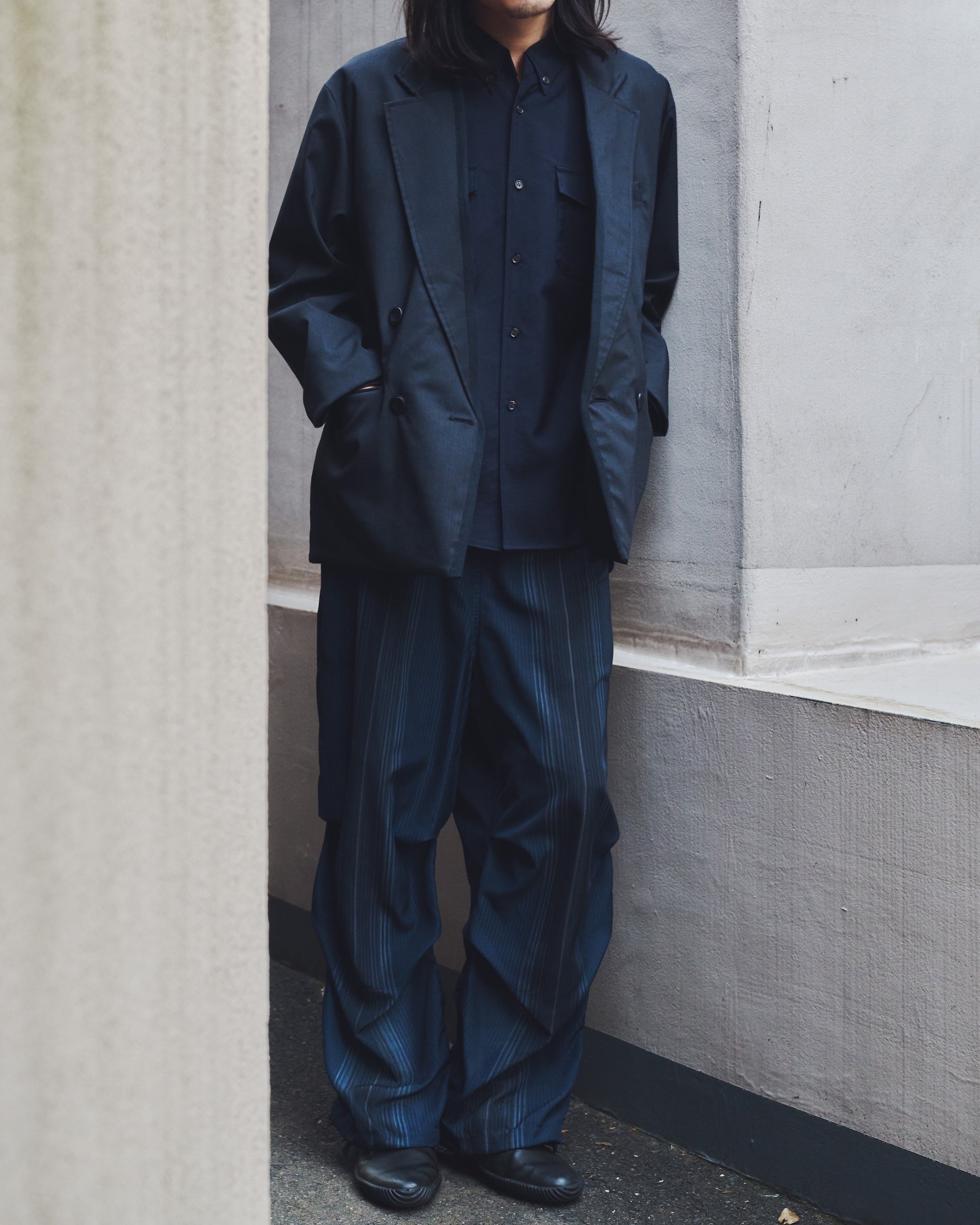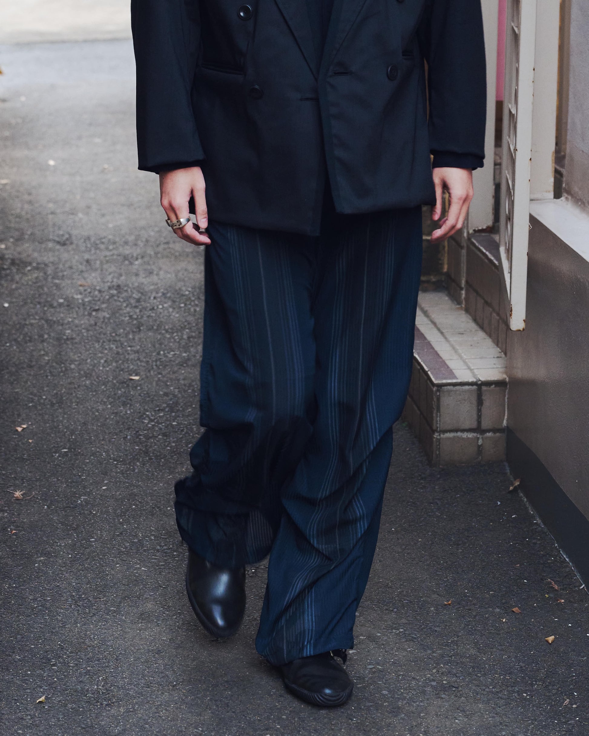 イージーパンツ仕様。スピンドル配置。裾部分にもシルエット変更出来るようドローコードを配置。