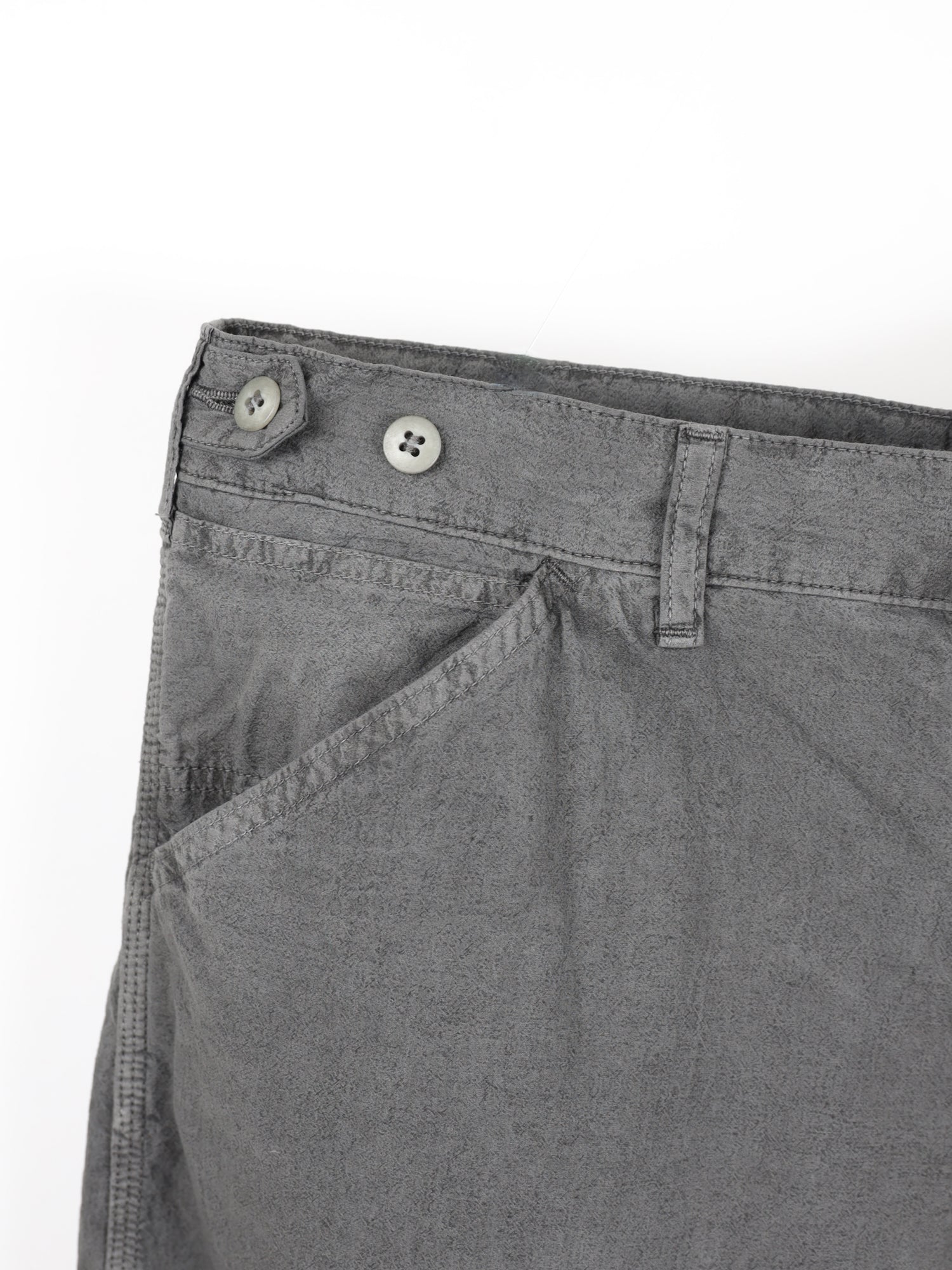 素材には、強撚糸を高密度に織り上げたドライな風合いのダンプ生地を採用。仕上げには、滋賀・近江地方の伝統技法「近江晒」を用い、灰汁で晒した後に天日干しすることで、自然なシワ感とふっくらした質感を引き出しています。強撚糸特有のシャリ感とドライな肌離れが、暑い季節でも快適な穿き心地をサポート。