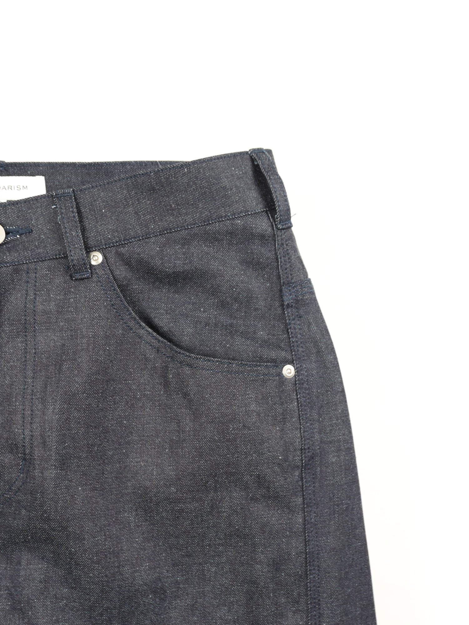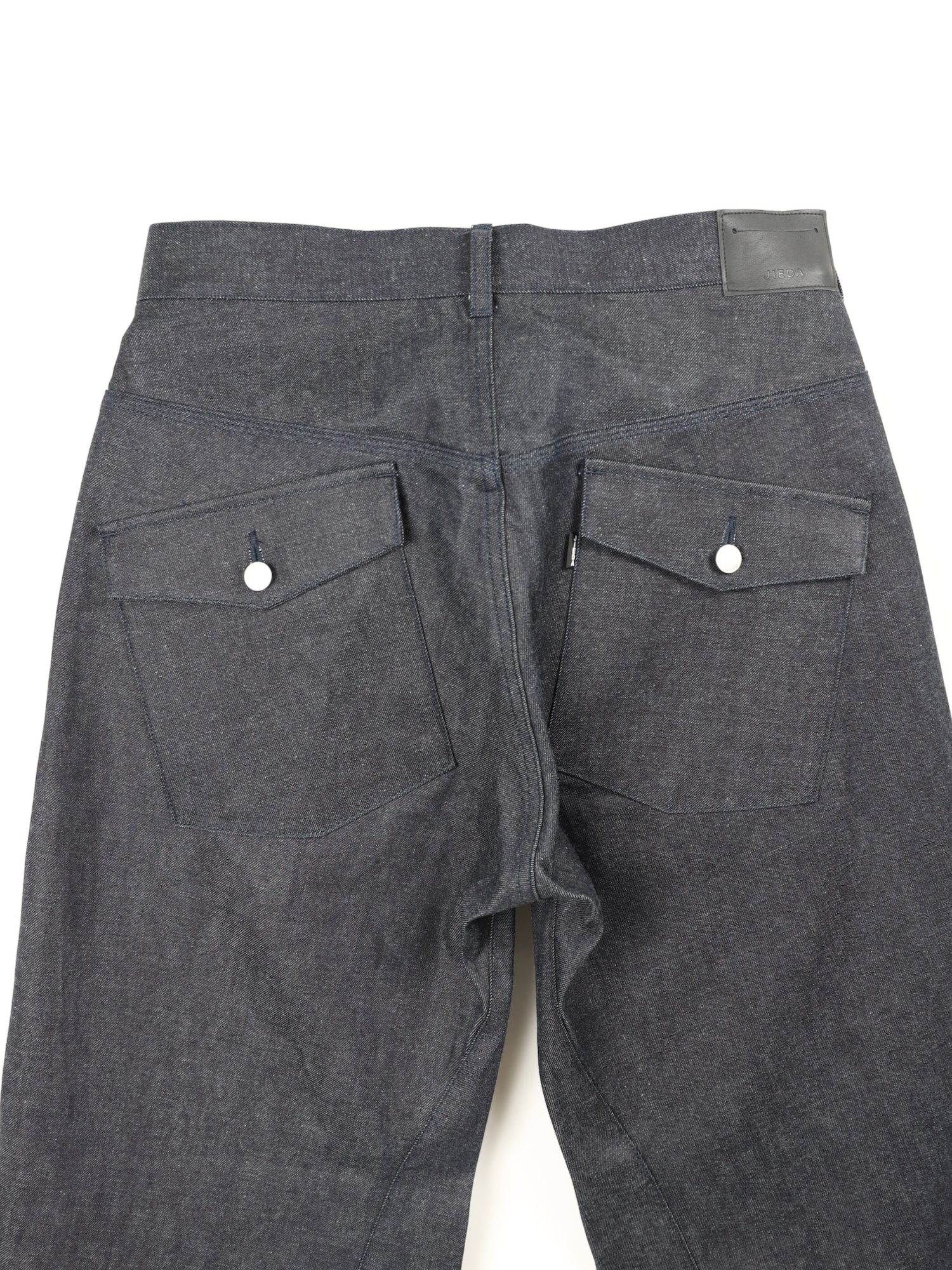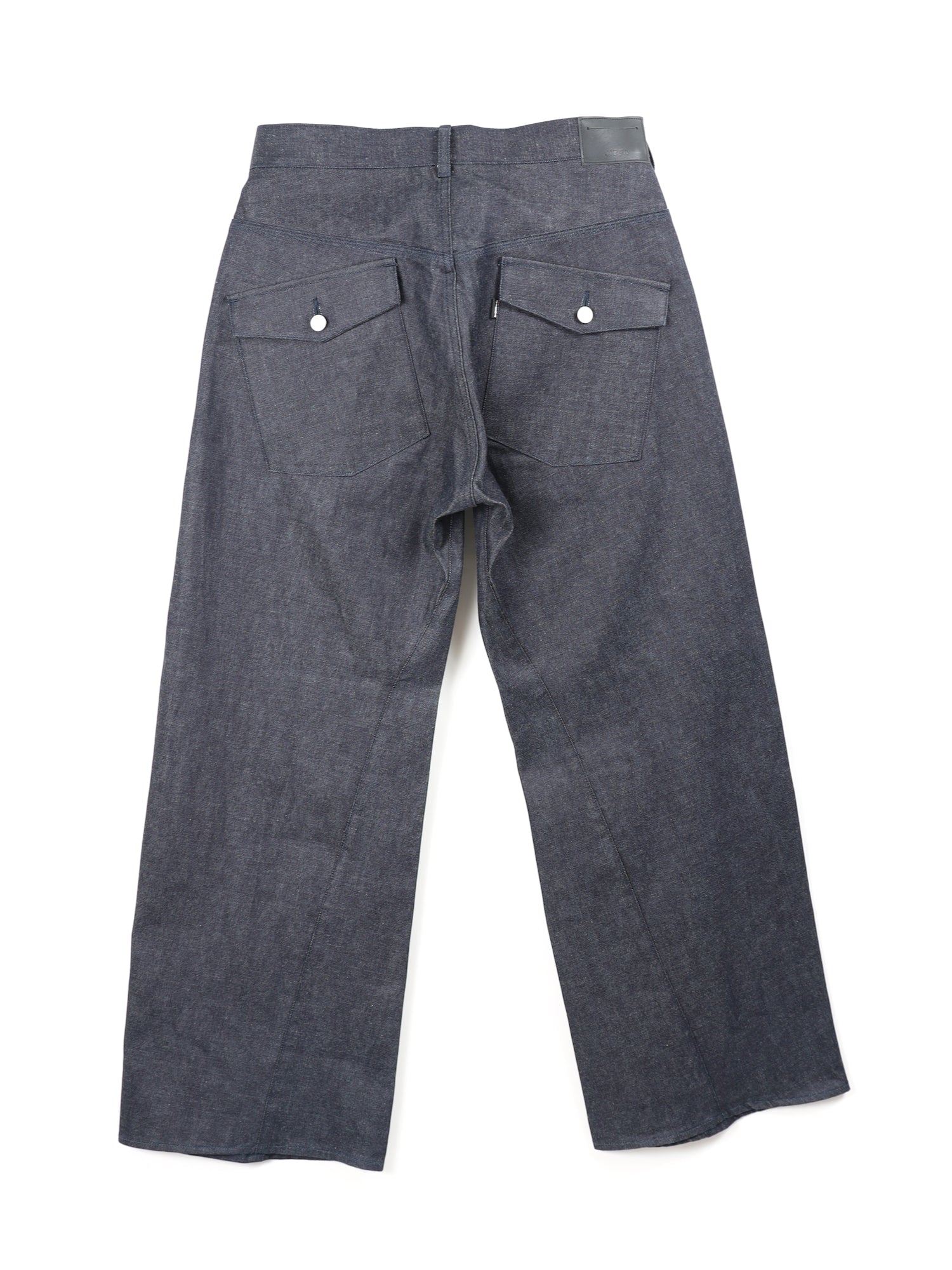 立体的なパターンによるサイドシームの捻れが独特なシルエットを生み出し、股上を浅めに設定することで腰回りはスッキリとしたシルエットが特徴的なワイドデニムとなっております。