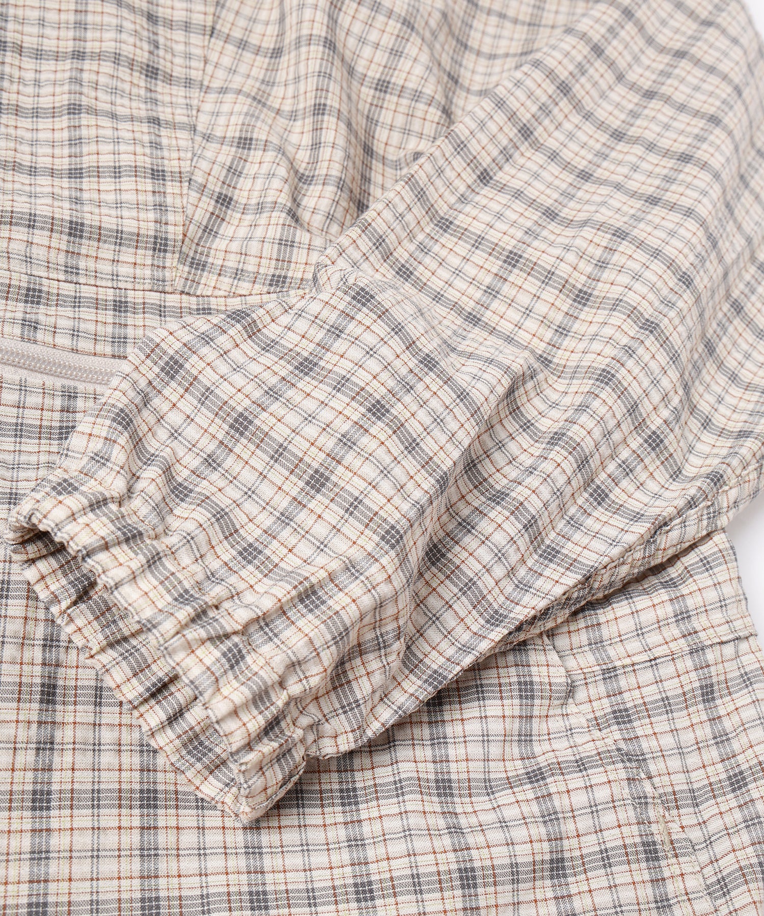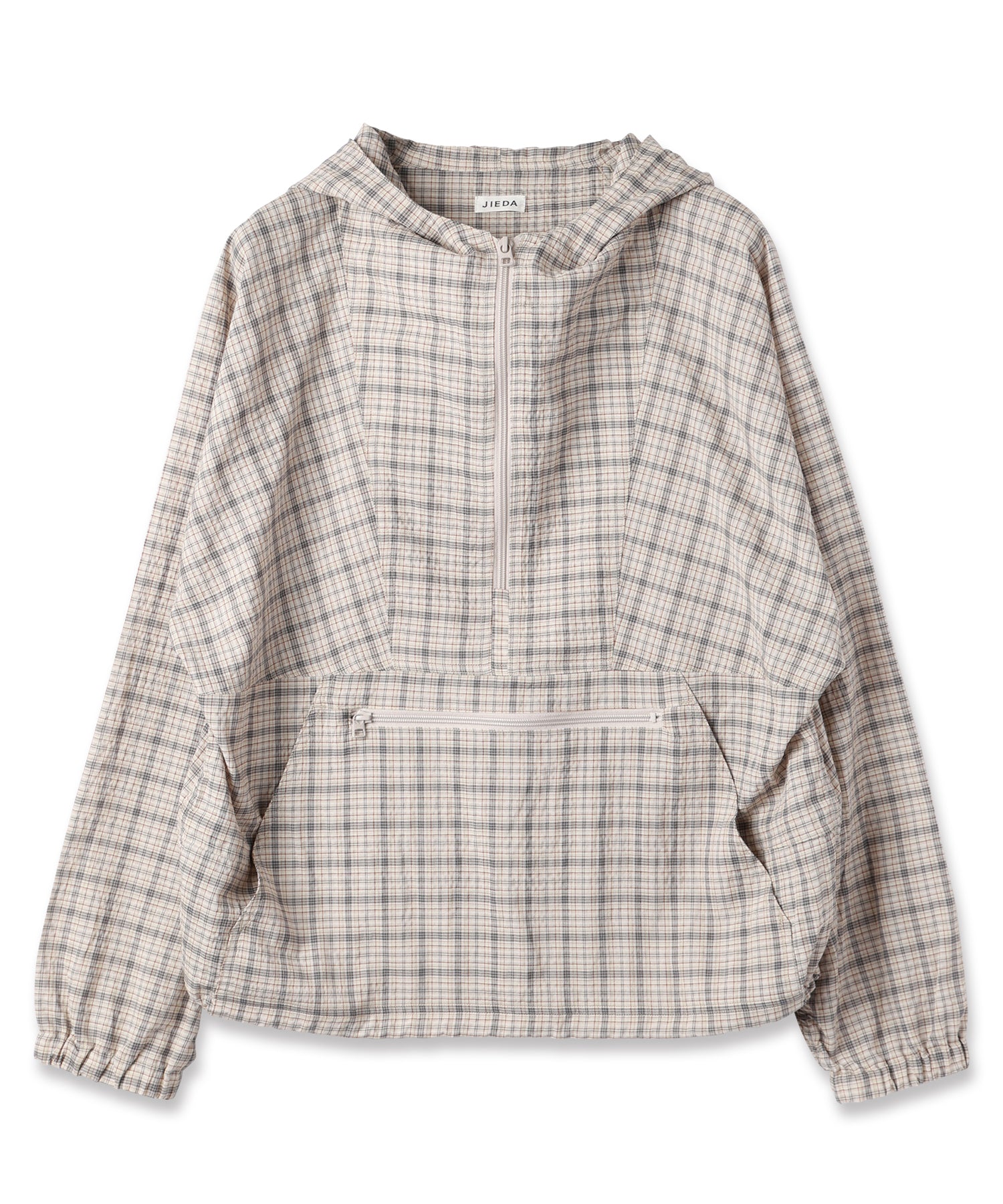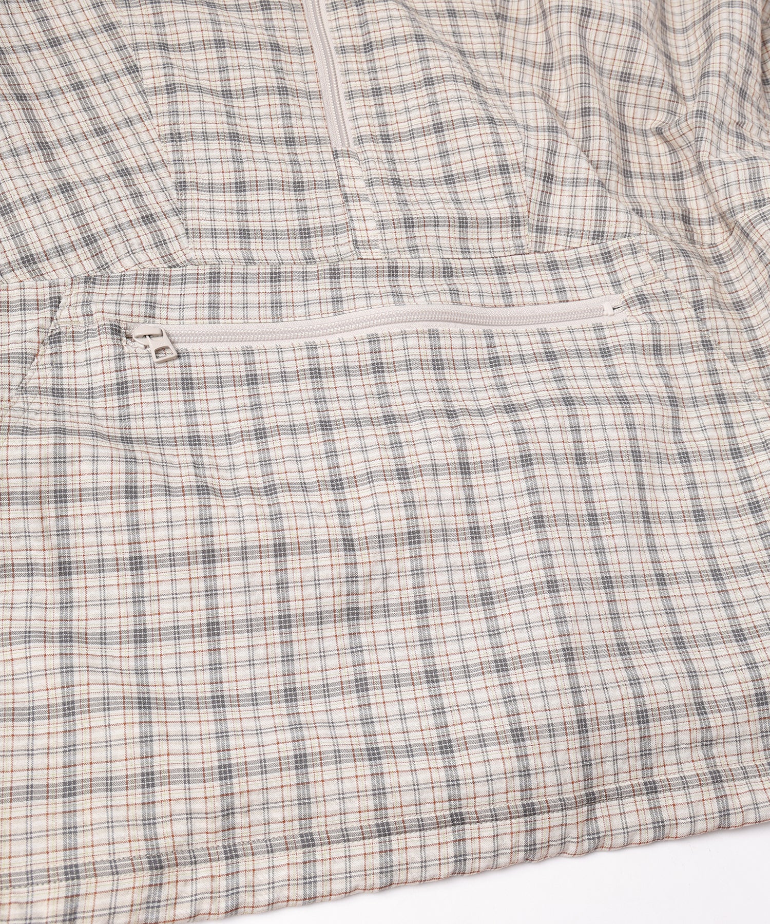 シアサッカーチェック生地とチョークストライプ生地を使用したプルオーバーパーカー。