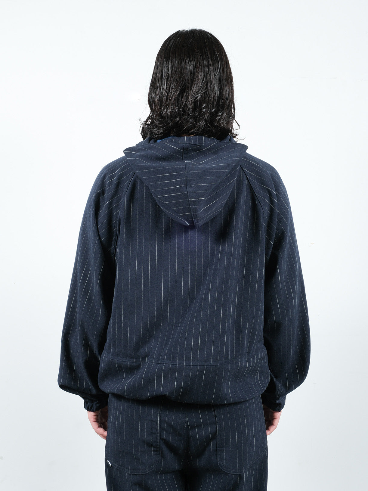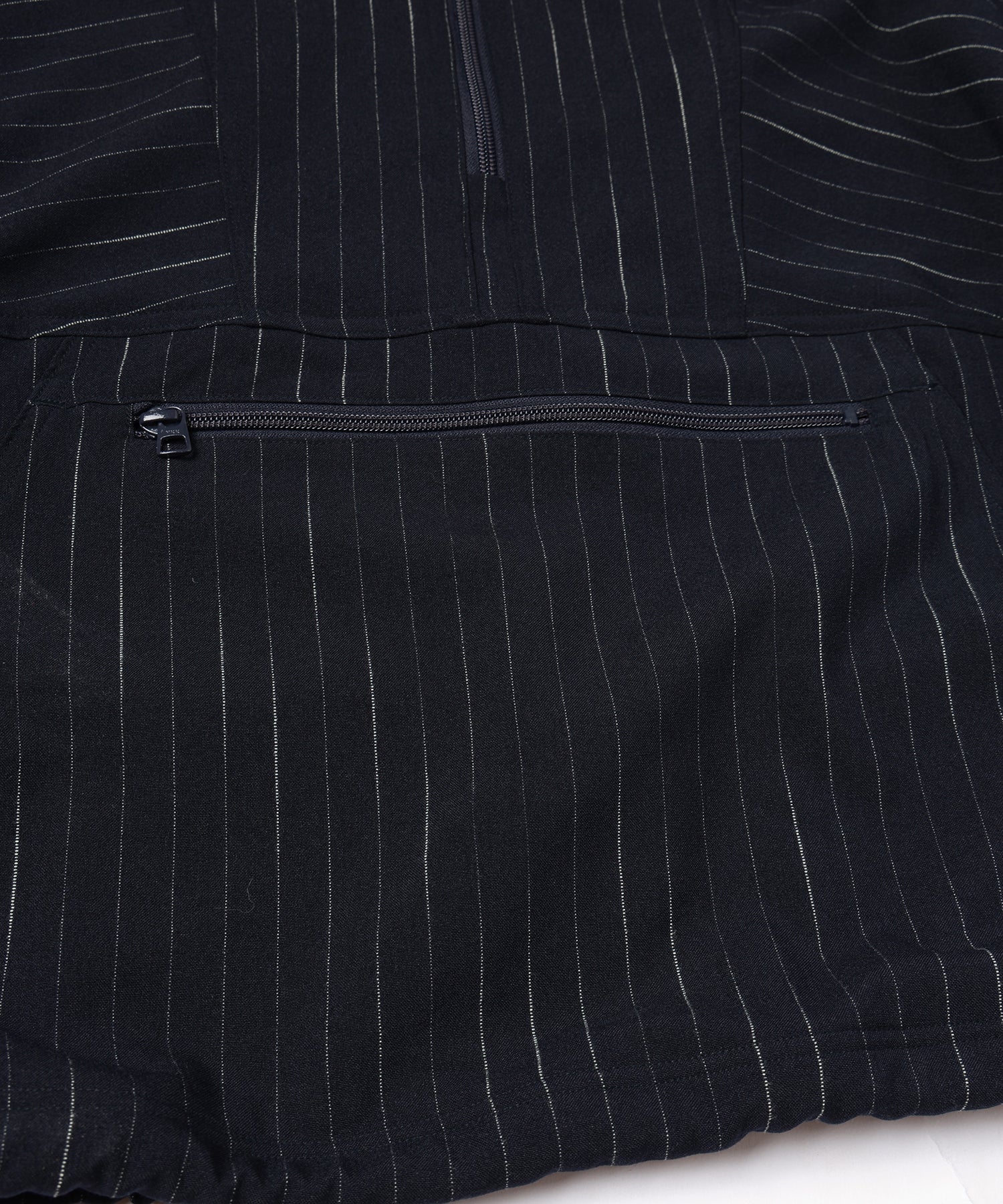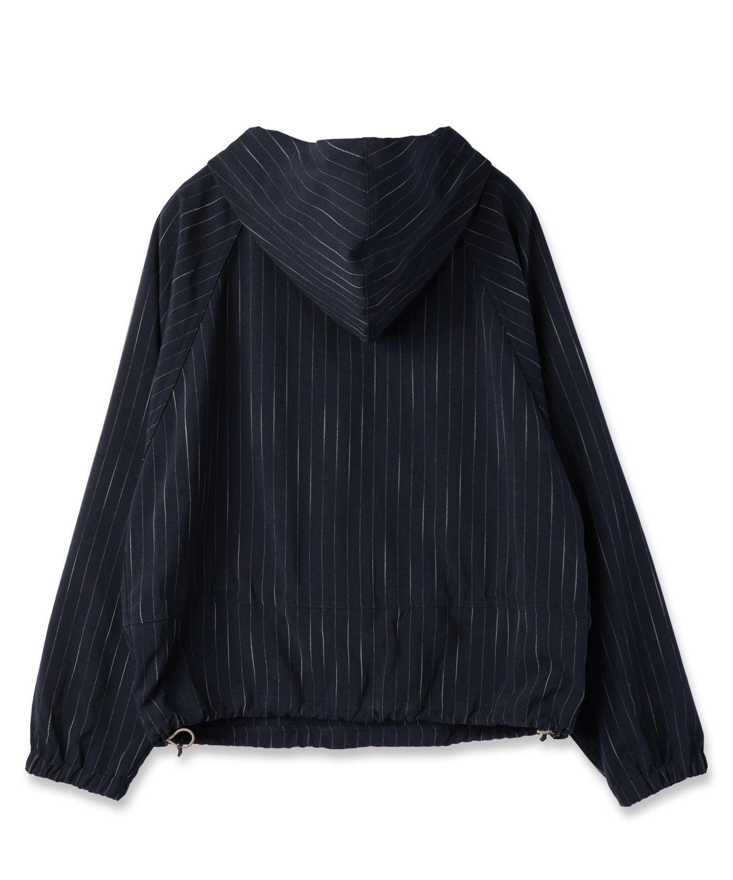 シアサッカーチェック生地とチョークストライプ生地を使用したプルオーバーパーカー。