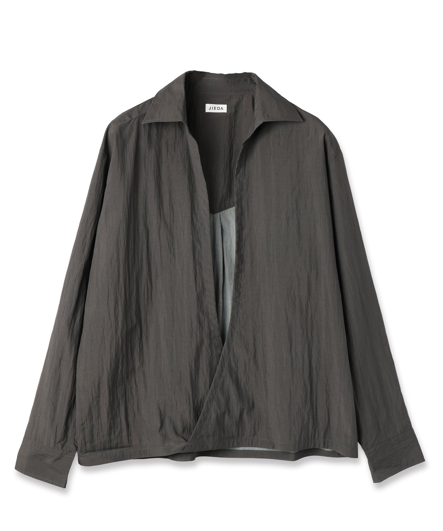 ボックスシルエットでスキッパー仕様のプルオーバーとなっており、後中心はV字のインバーテッドプリーツのデザインを採用。