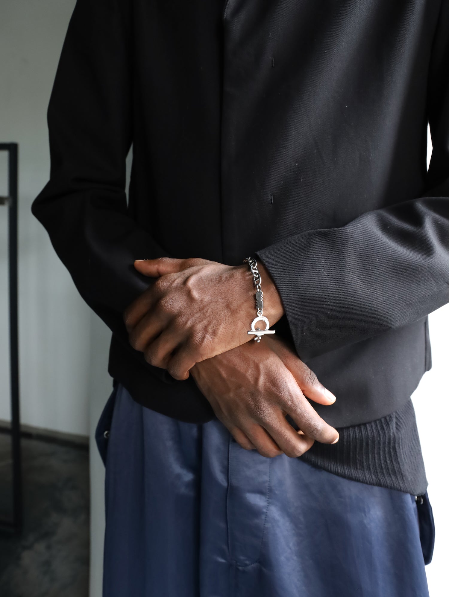 マンテルタイプの留め具を採用したため着脱もしやすく、ブランドロゴのネームパーツを組み込んだブレスレットとなっております。
