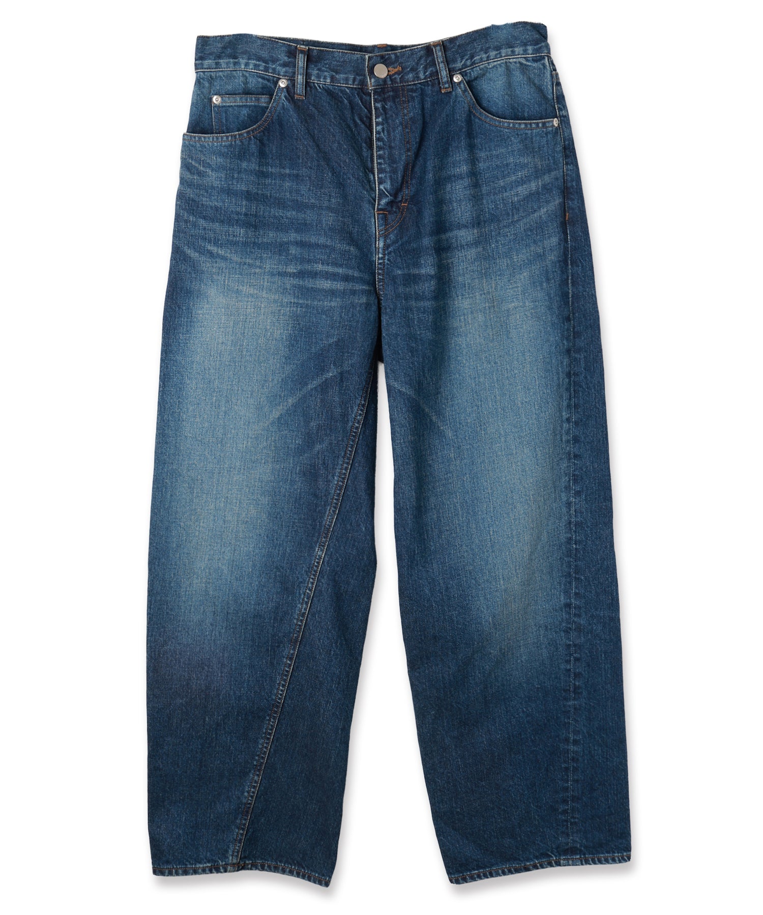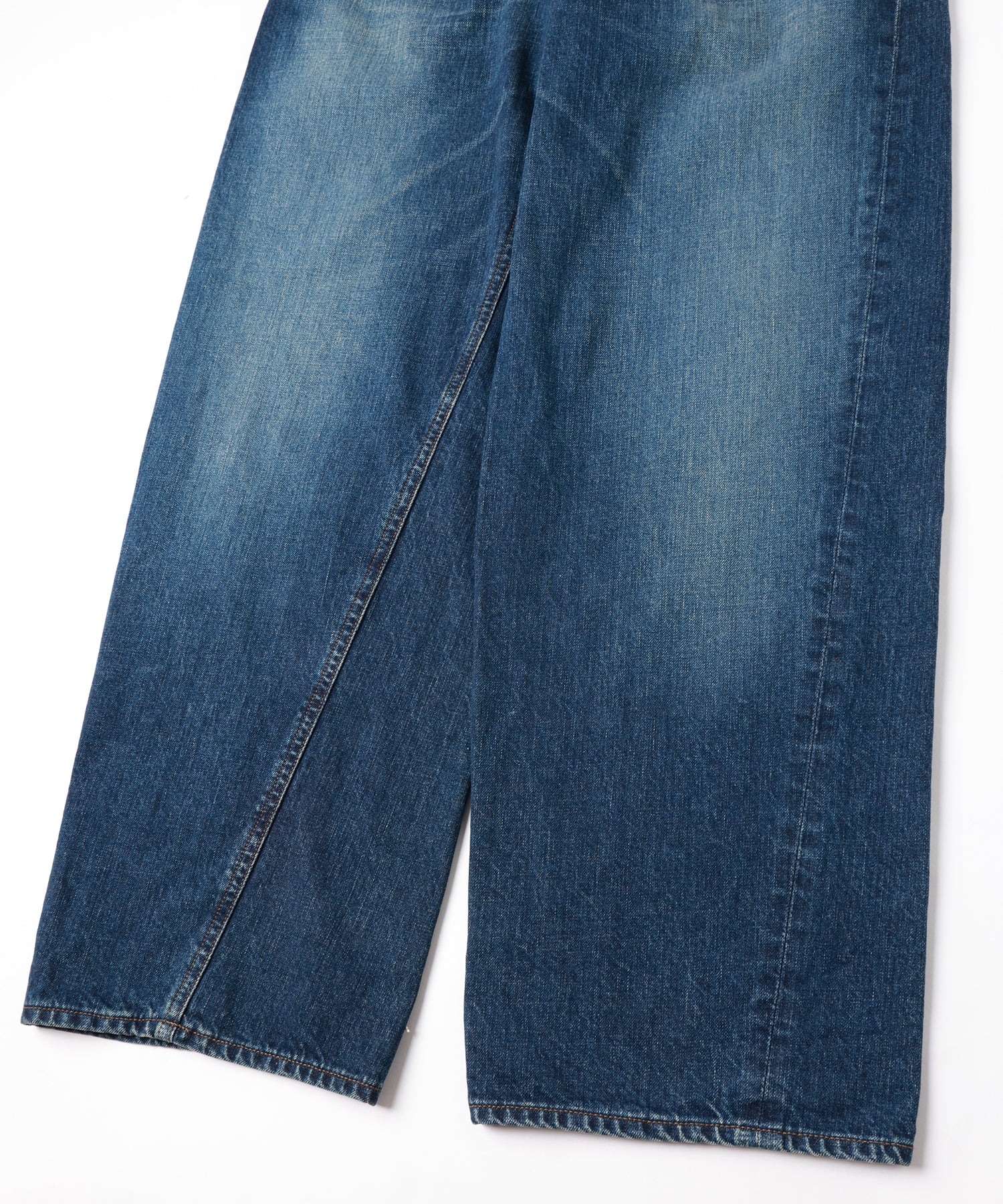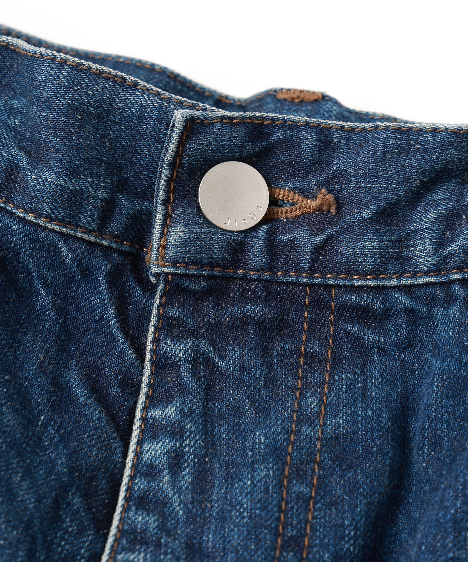 生地は12ozの国産デニム素材を使用。デニムに洗いをかけ色を落とし、ウエストのヒゲ加工やもものスリ加工を施すことで表情のあるデニムとなっております。