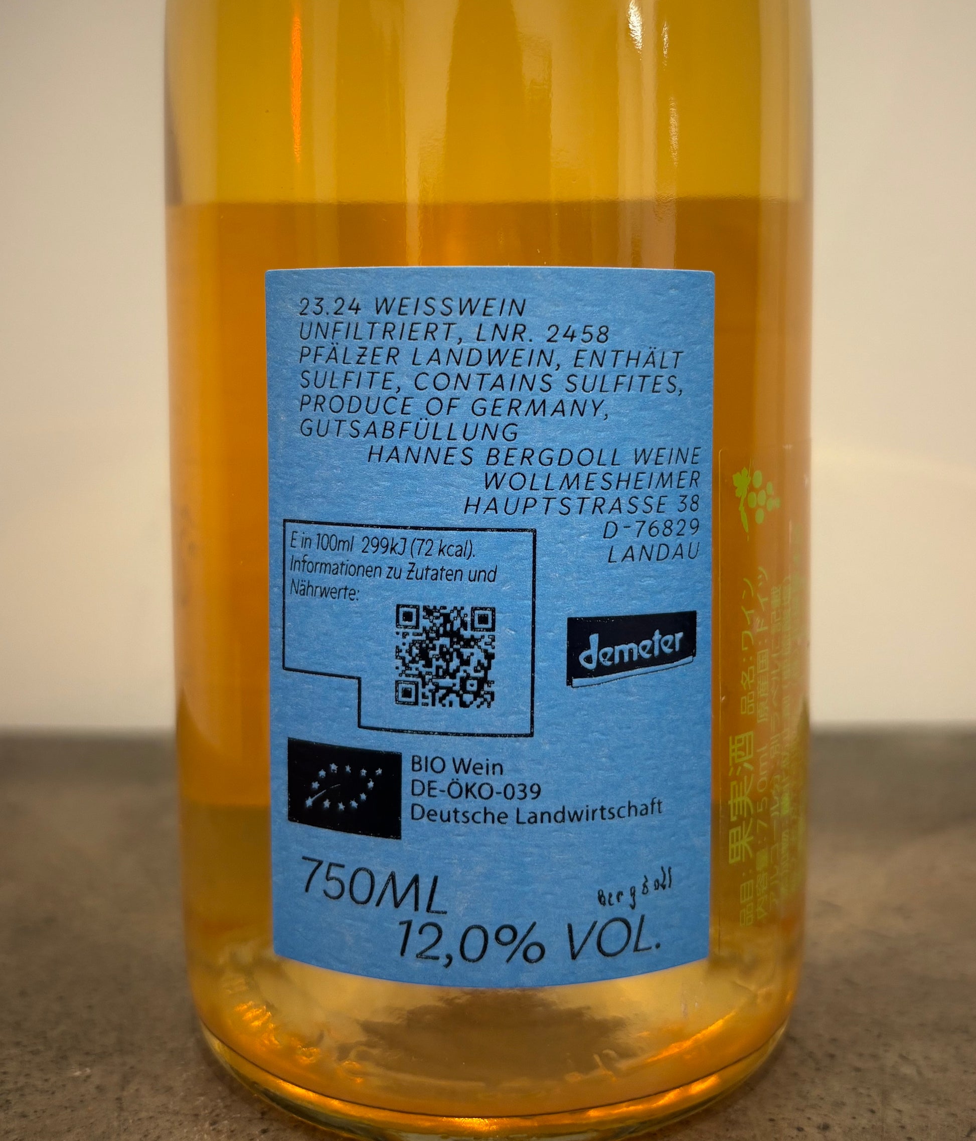品種 : 2024 年 VT60% ( ムスカテラー、ゲヴェルツ、ソービニヨンブランのマセとリースリングのダイレクトプレス各 1/4 ) 、2023 年のキュベ 40% ( ミュラートゥルガウ、ケルナー、ムスカテラー )