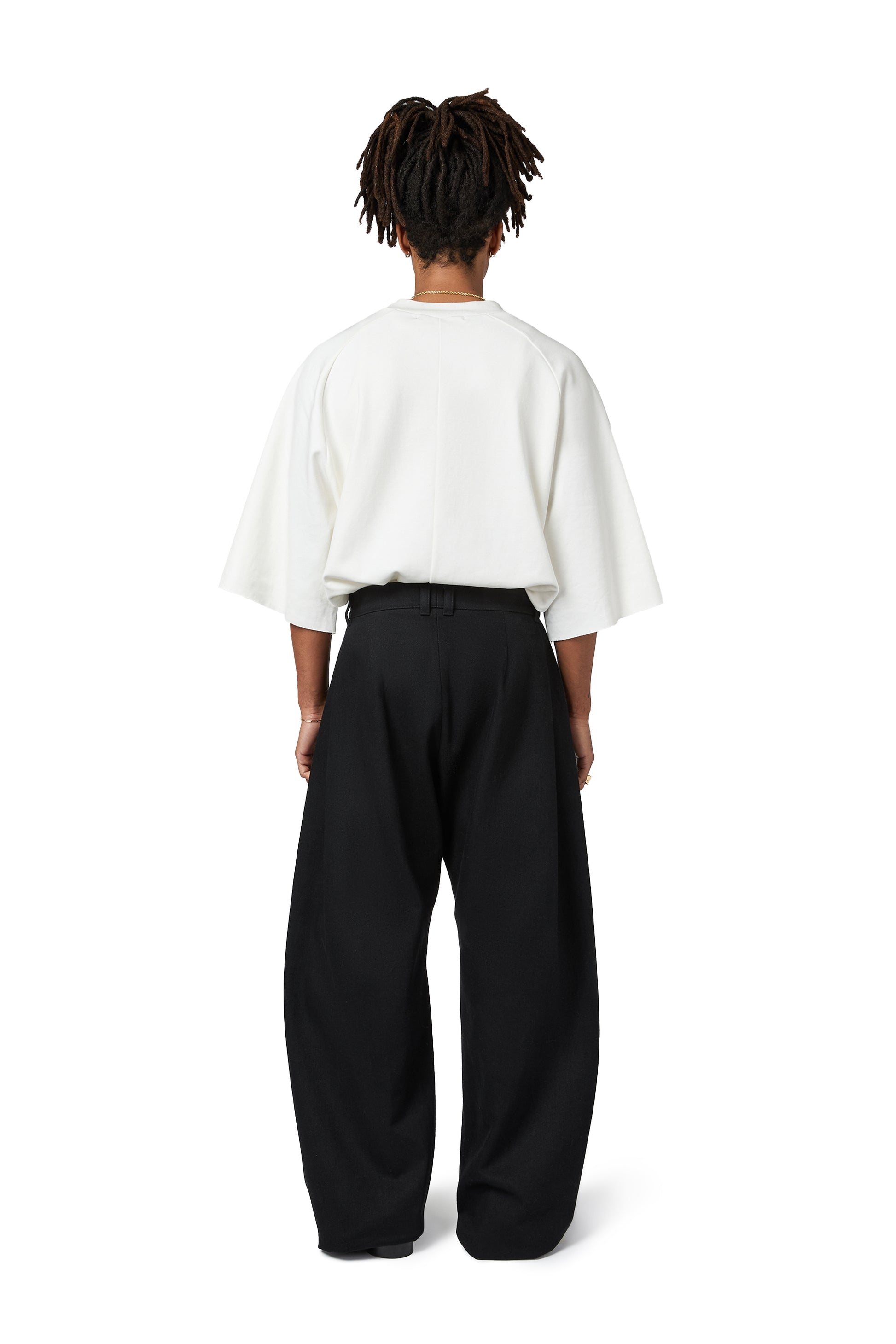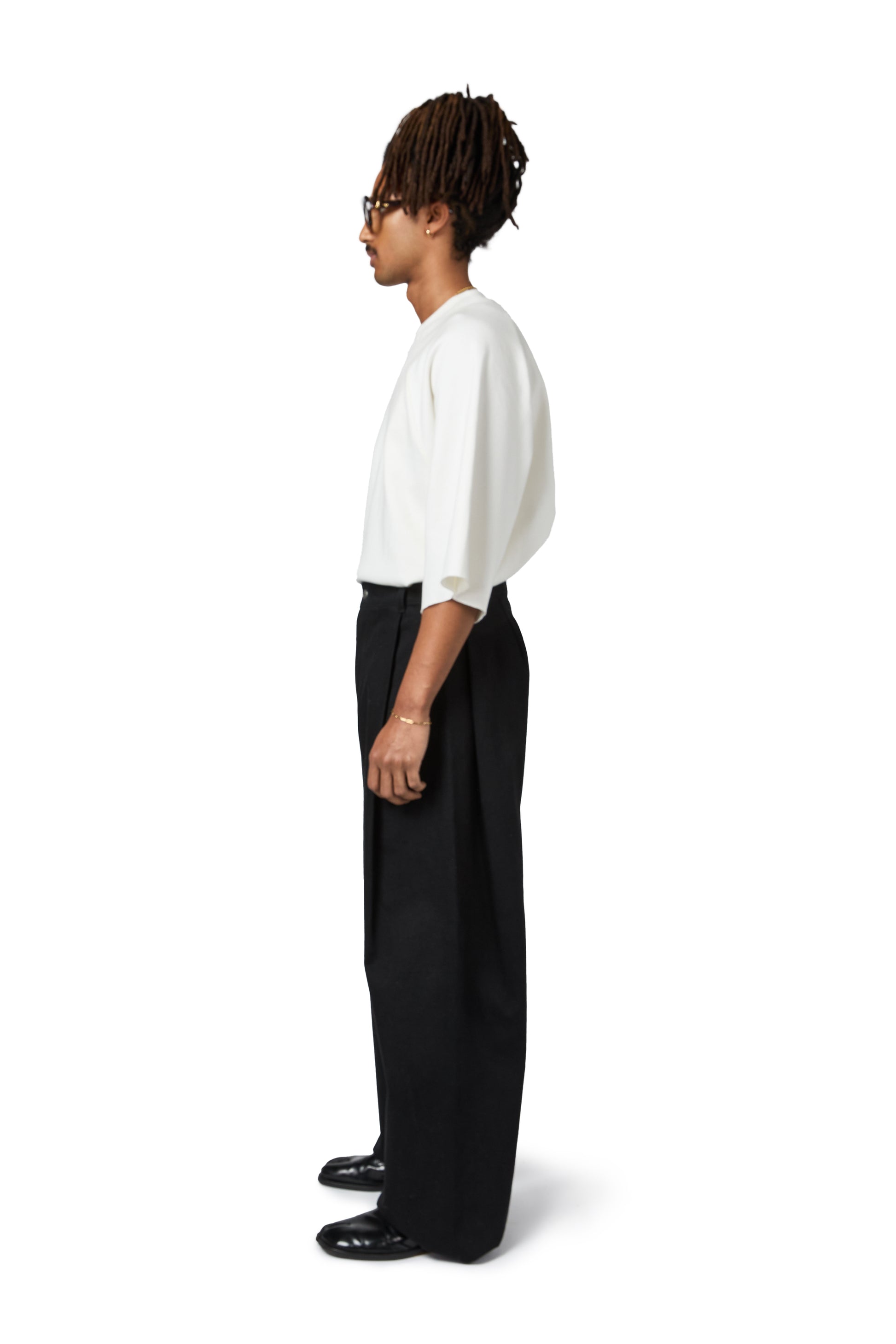ワイドレッグでゆったりとしたフィット感で、両脚のフロント中央にナイフプリーツが施され、隠しフロントポケットが隠れています。
