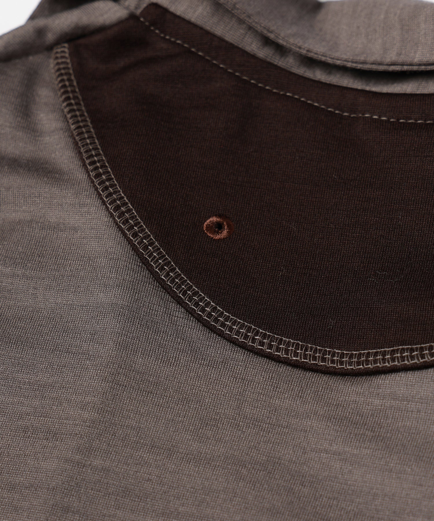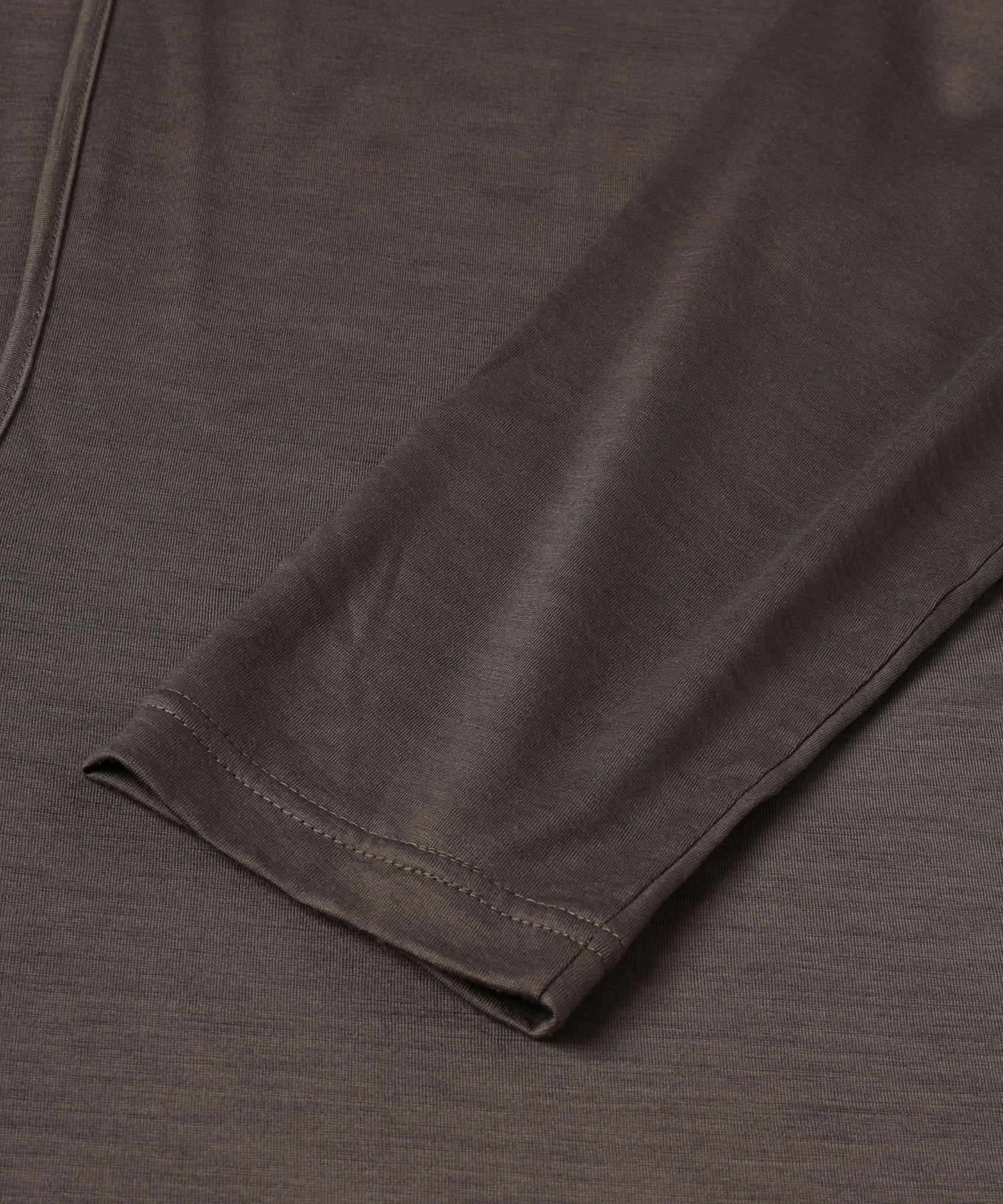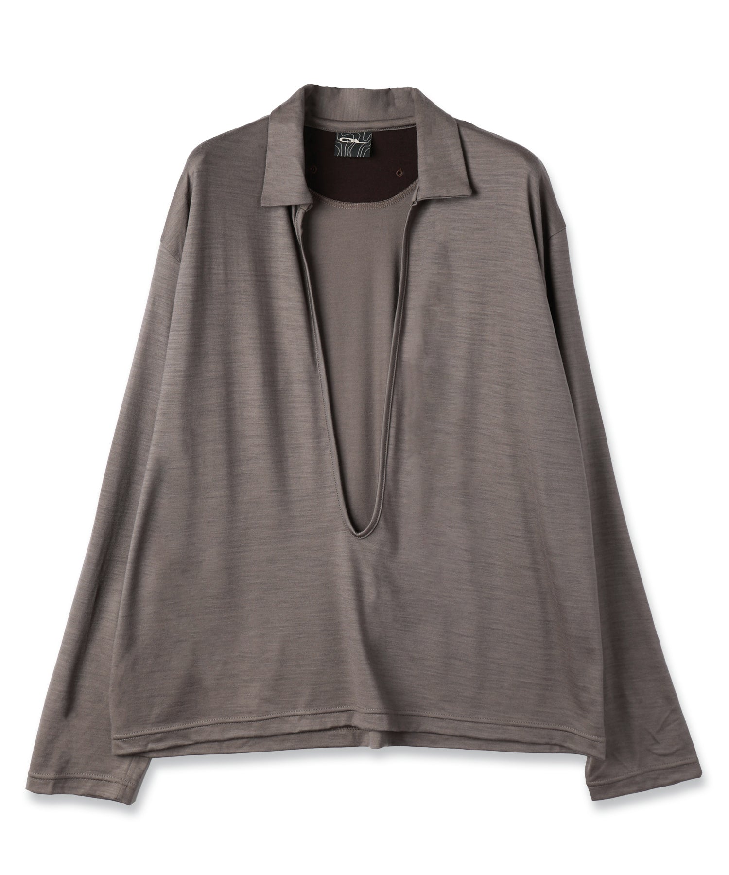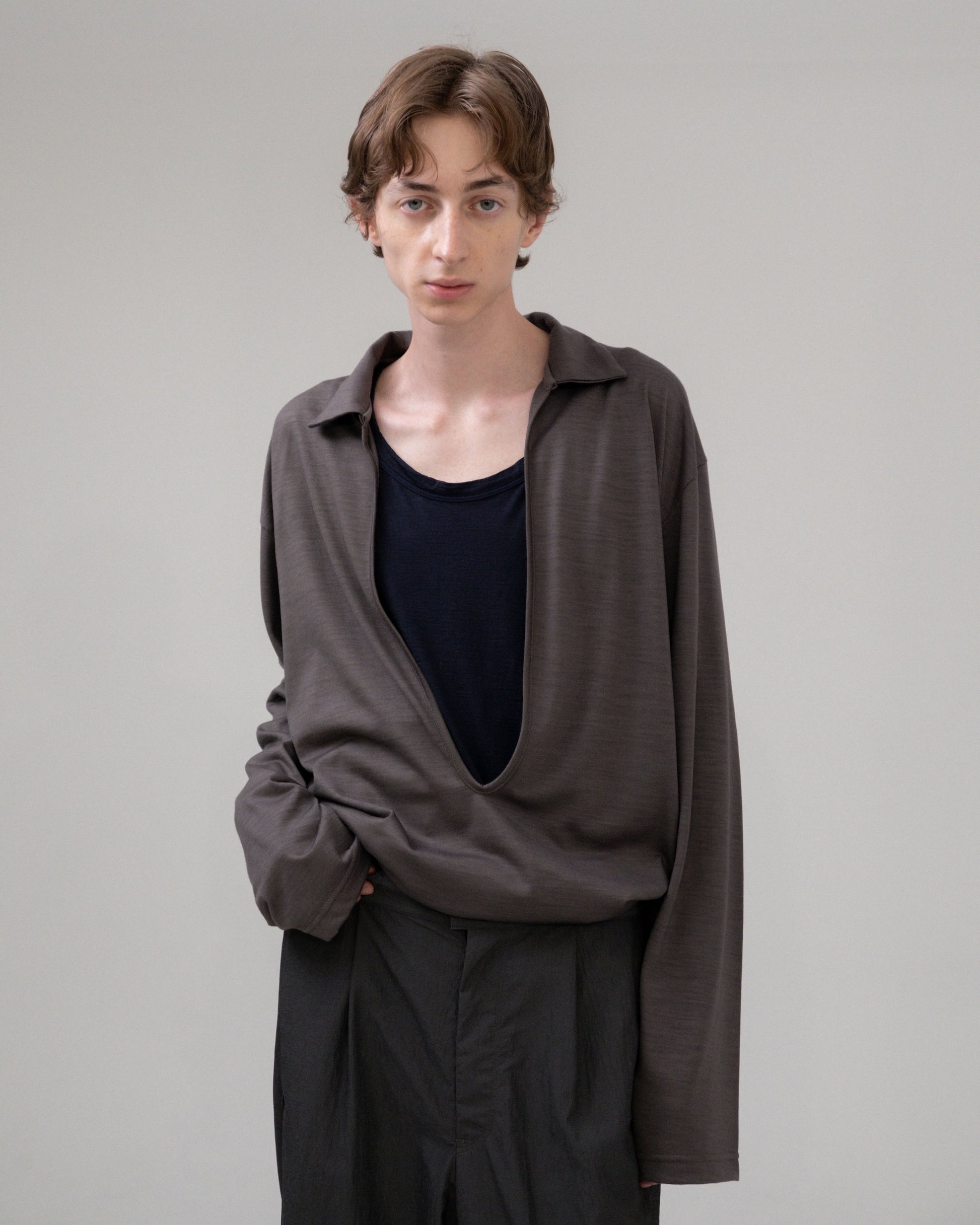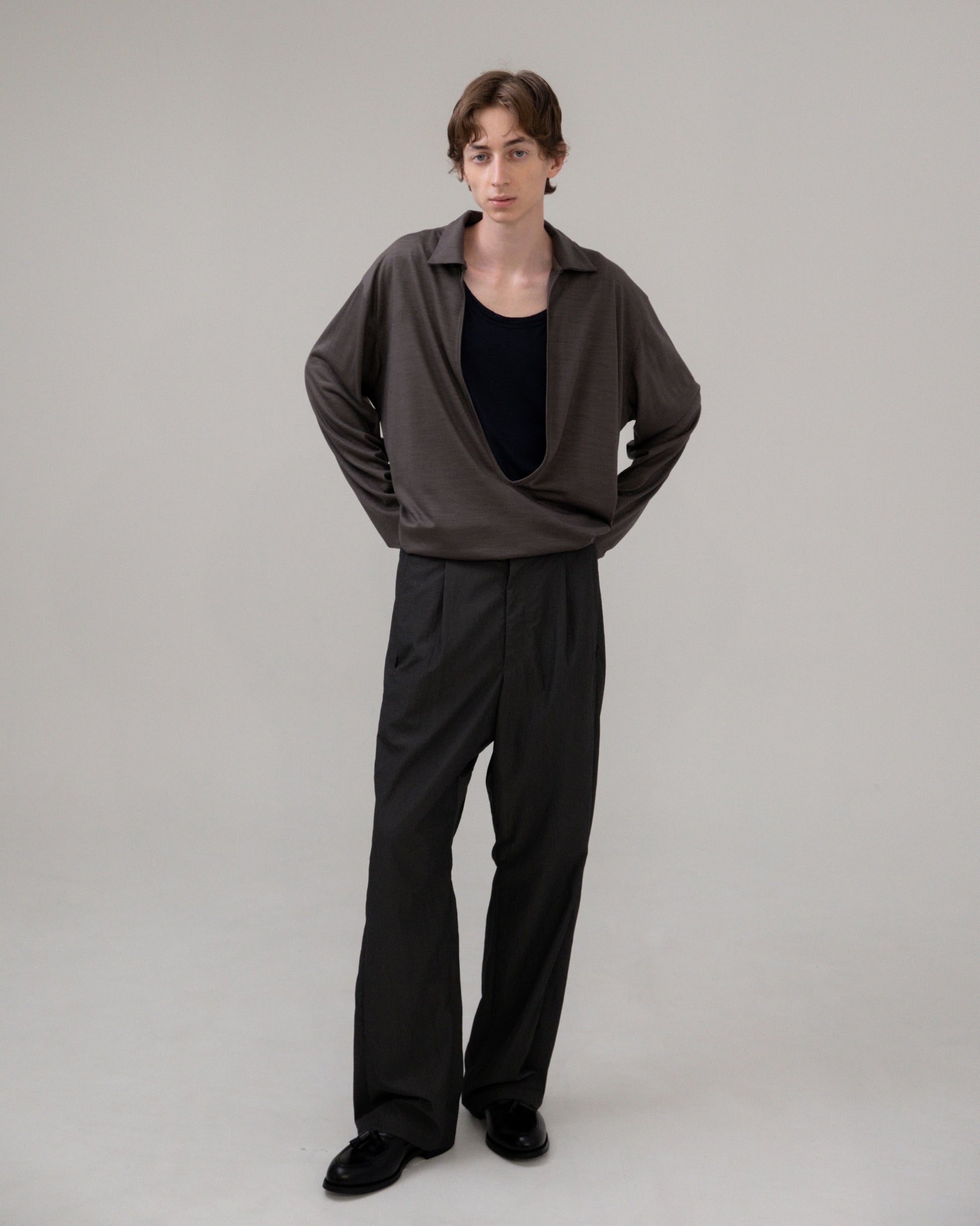 胸元が大きく開いたフロントのV字デザインがリラックスしたムードを演出し、生地と相まってモダンな印象のとなっております。