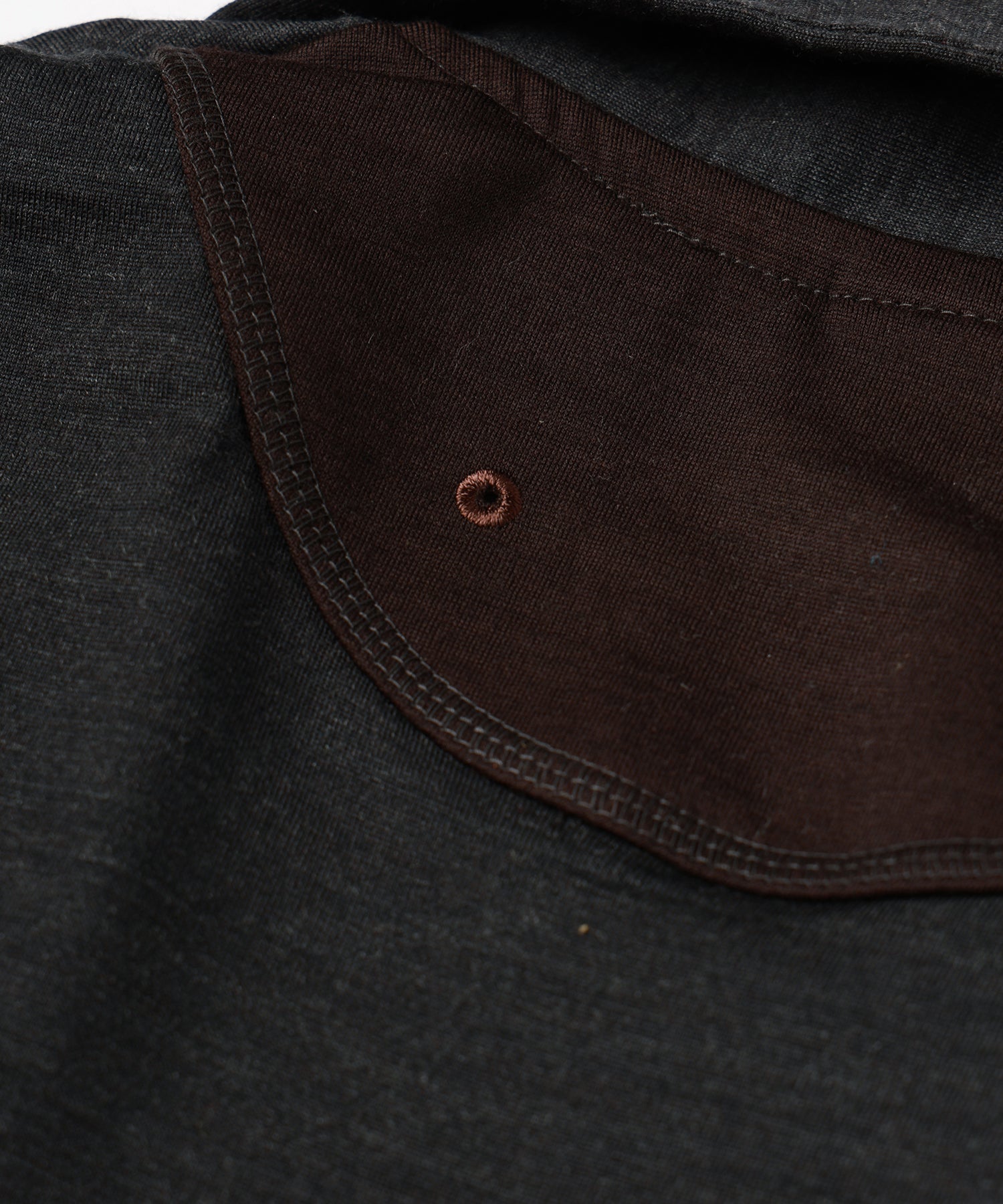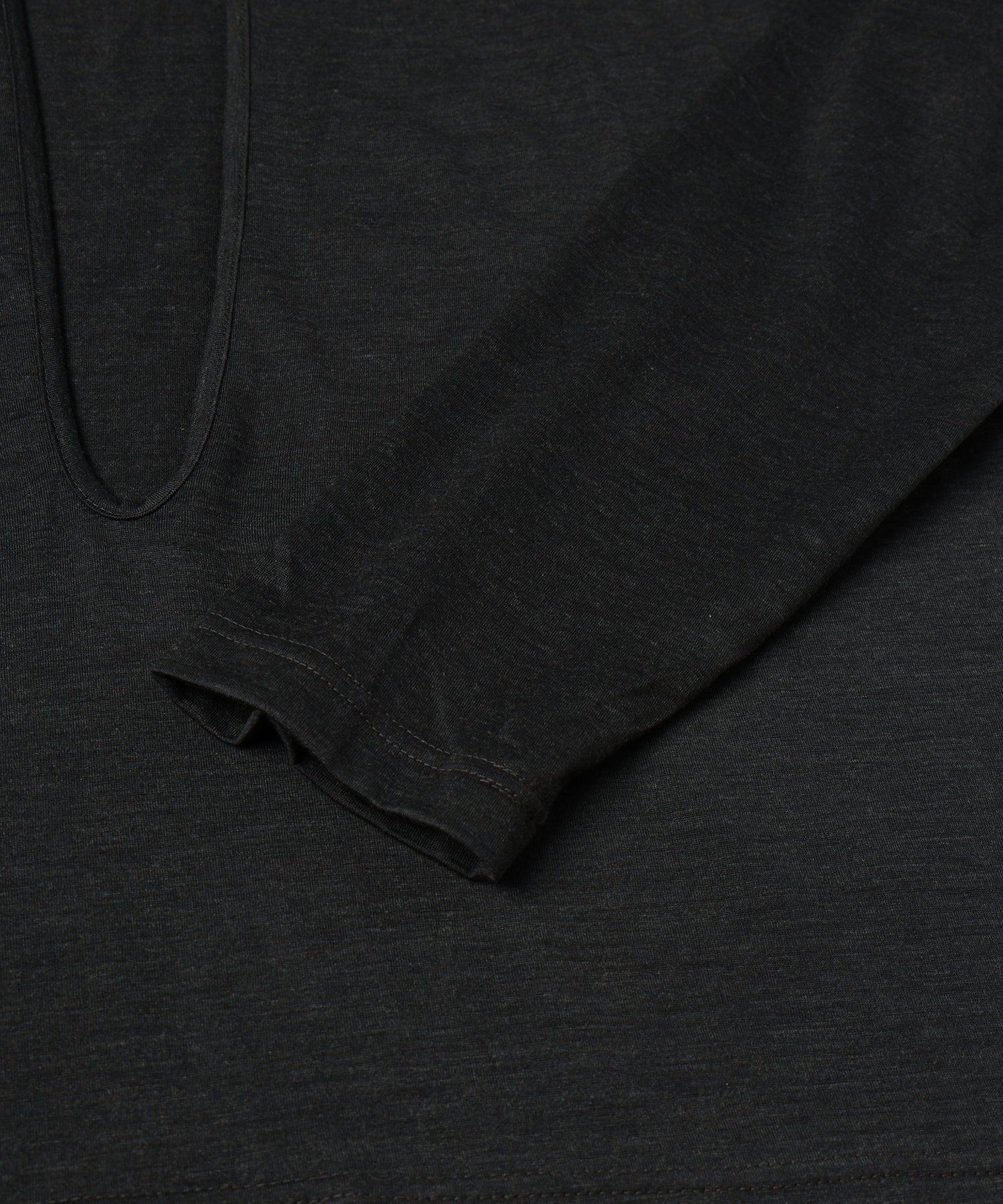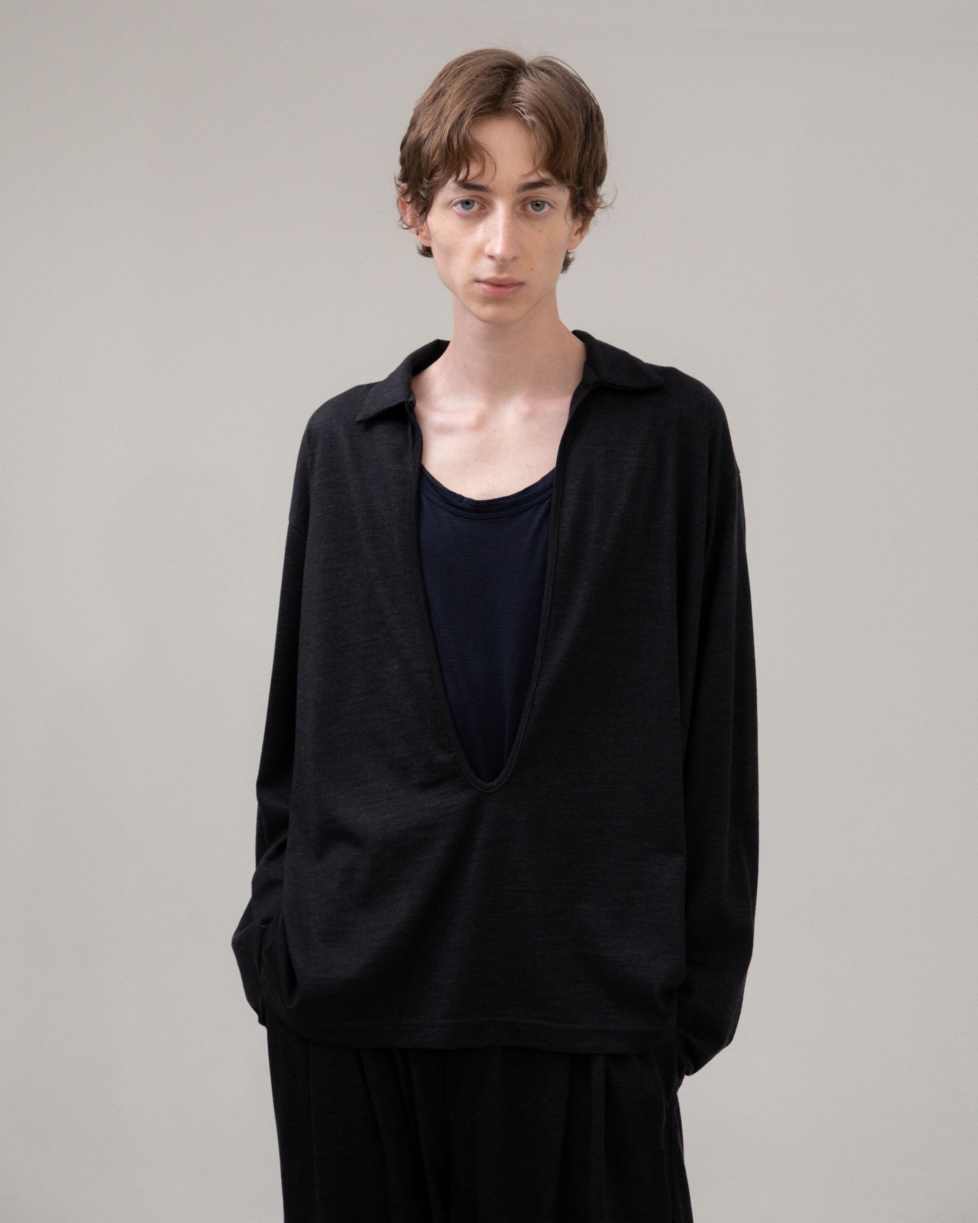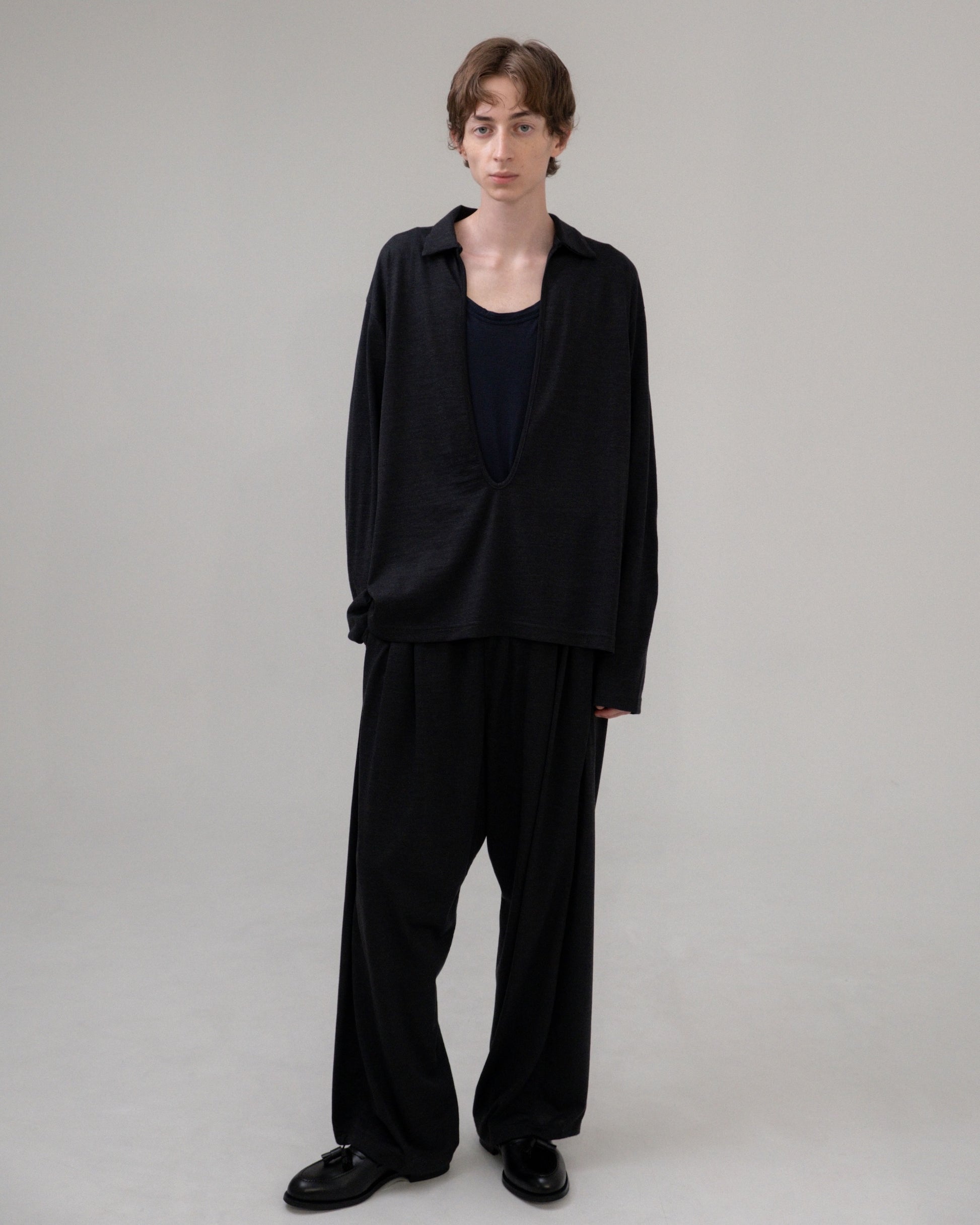 胸元が大きく開いたフロントのV字デザインがリラックスしたムードを演出し、生地と相まってモダンな印象のとなっております。