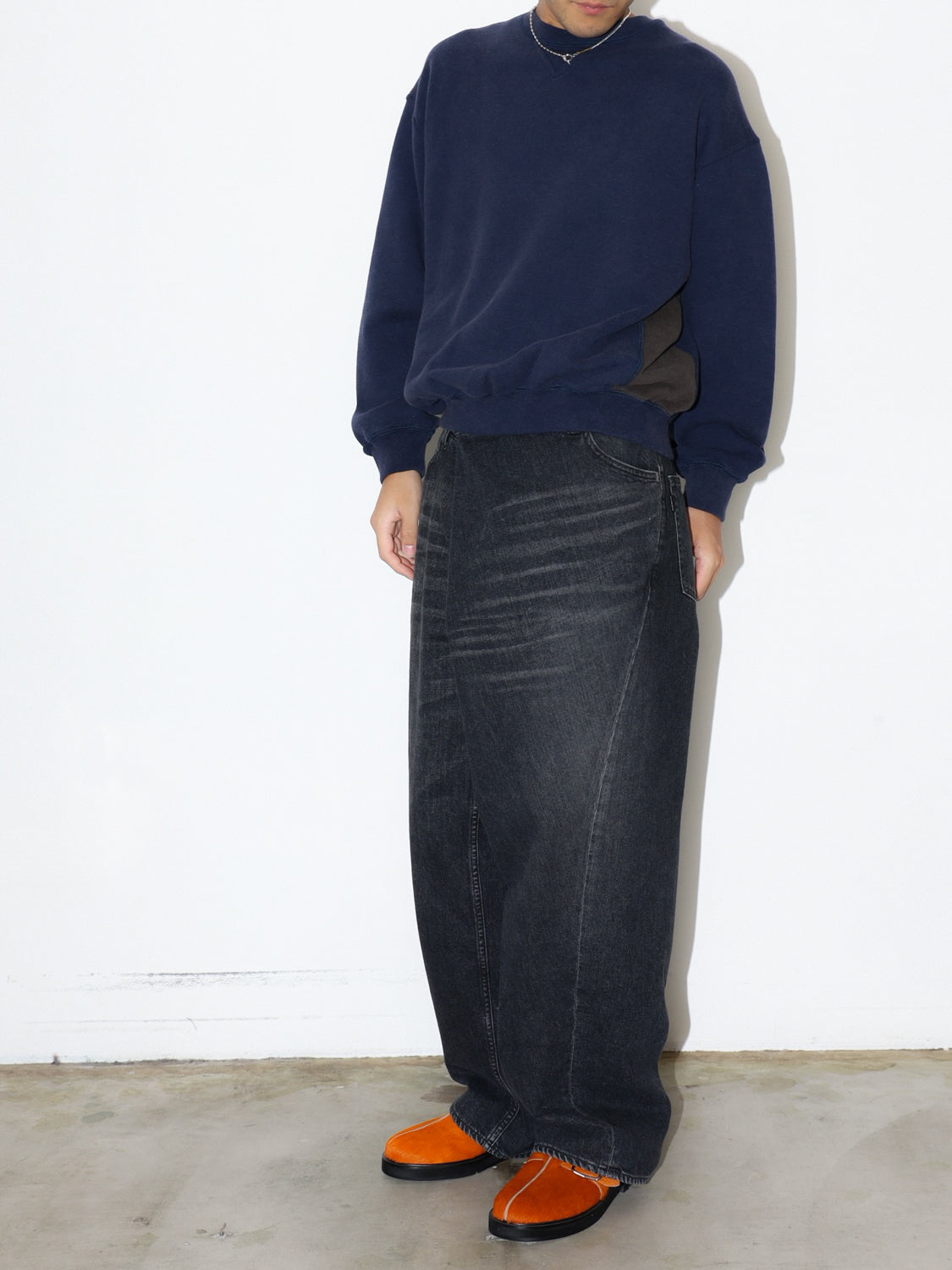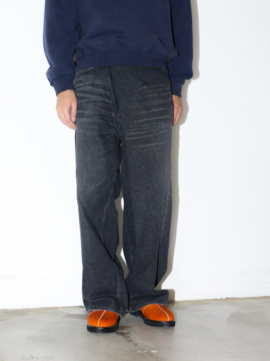 大きいウエストをつまみ腰回りのドレープ感が特徴的なオーバーラップデニムパンツ。