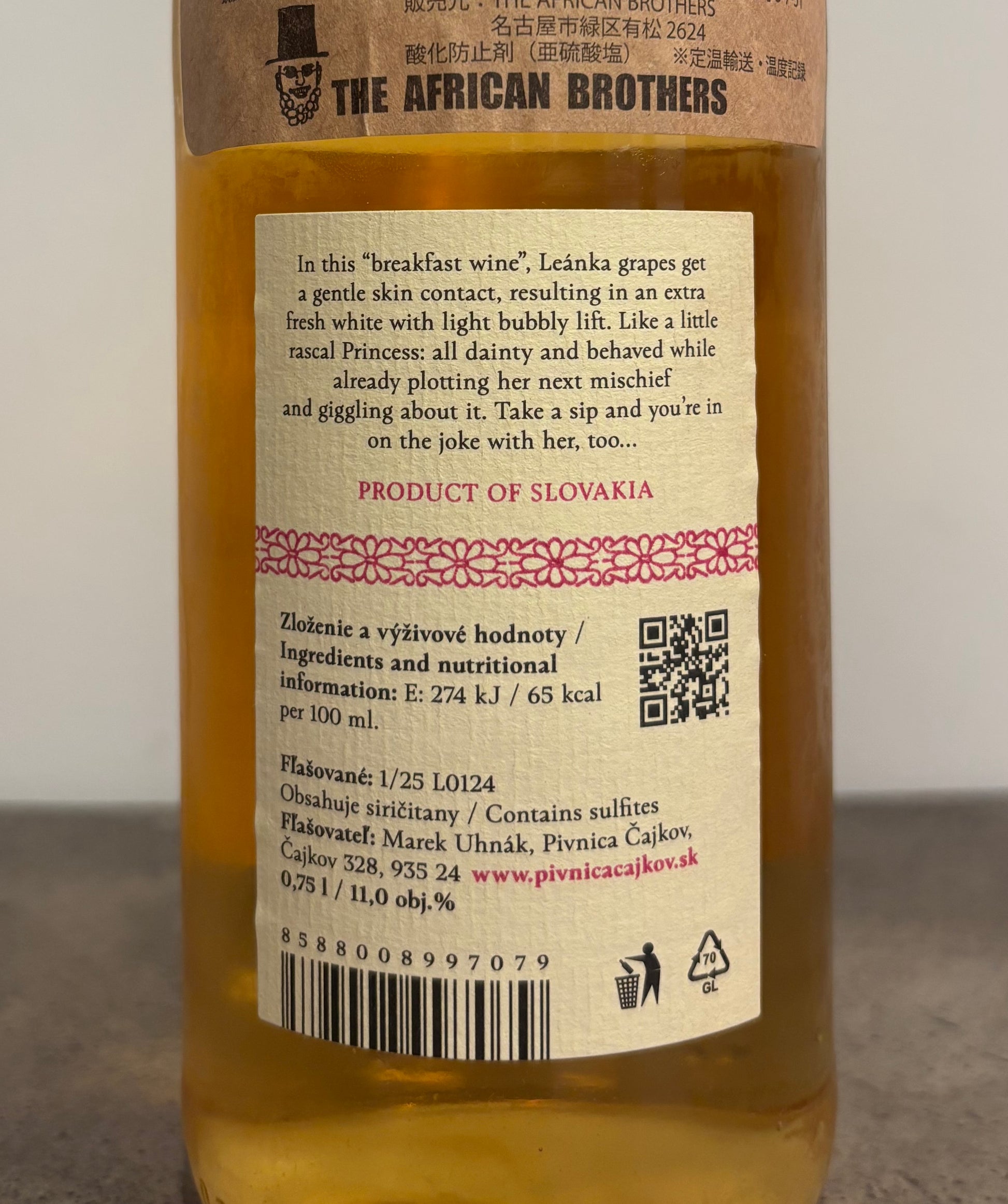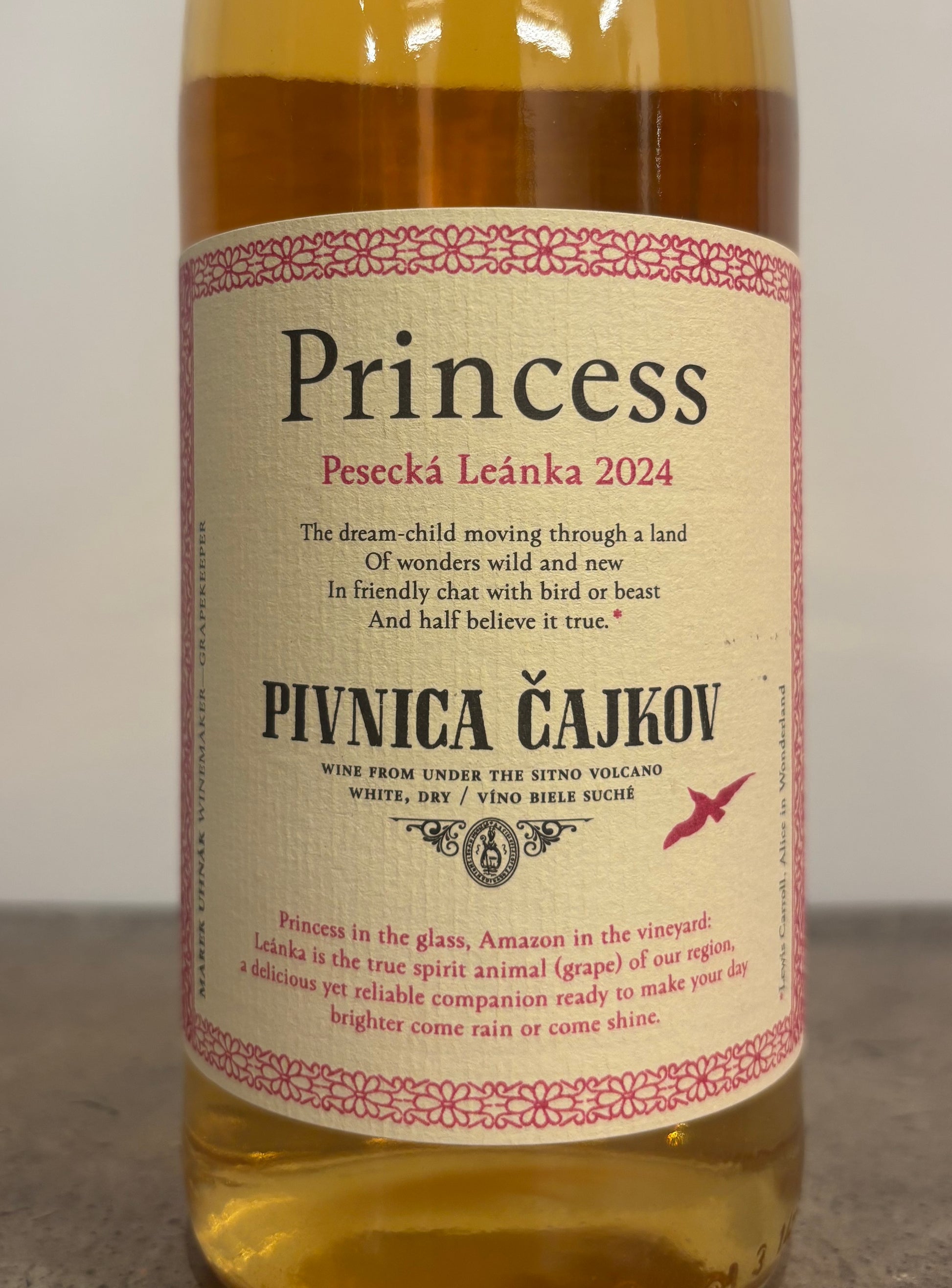 樹齢14年の赤い流紋岩土壌(結晶化したマグマ)のチャイコフ地区のスタラ・オラ畑(南スロバキア)のペセツカ・レアンカを使用。手摘みで収穫。選果後、除硬、破砕し、24時間スキンコンタクトし、フリーランジュースのみ(プレスせず)をステンレスタンクに澱と一緒に移し、6ヶ月間発酵、熟成。ノンフィルターにて瓶詰め。ブリンセス(王女様)という名前は、味わいのイメージが「純粋で、勇敢で、感情豊かで、能動的ですが、まだ無邪気」から名付けられた。