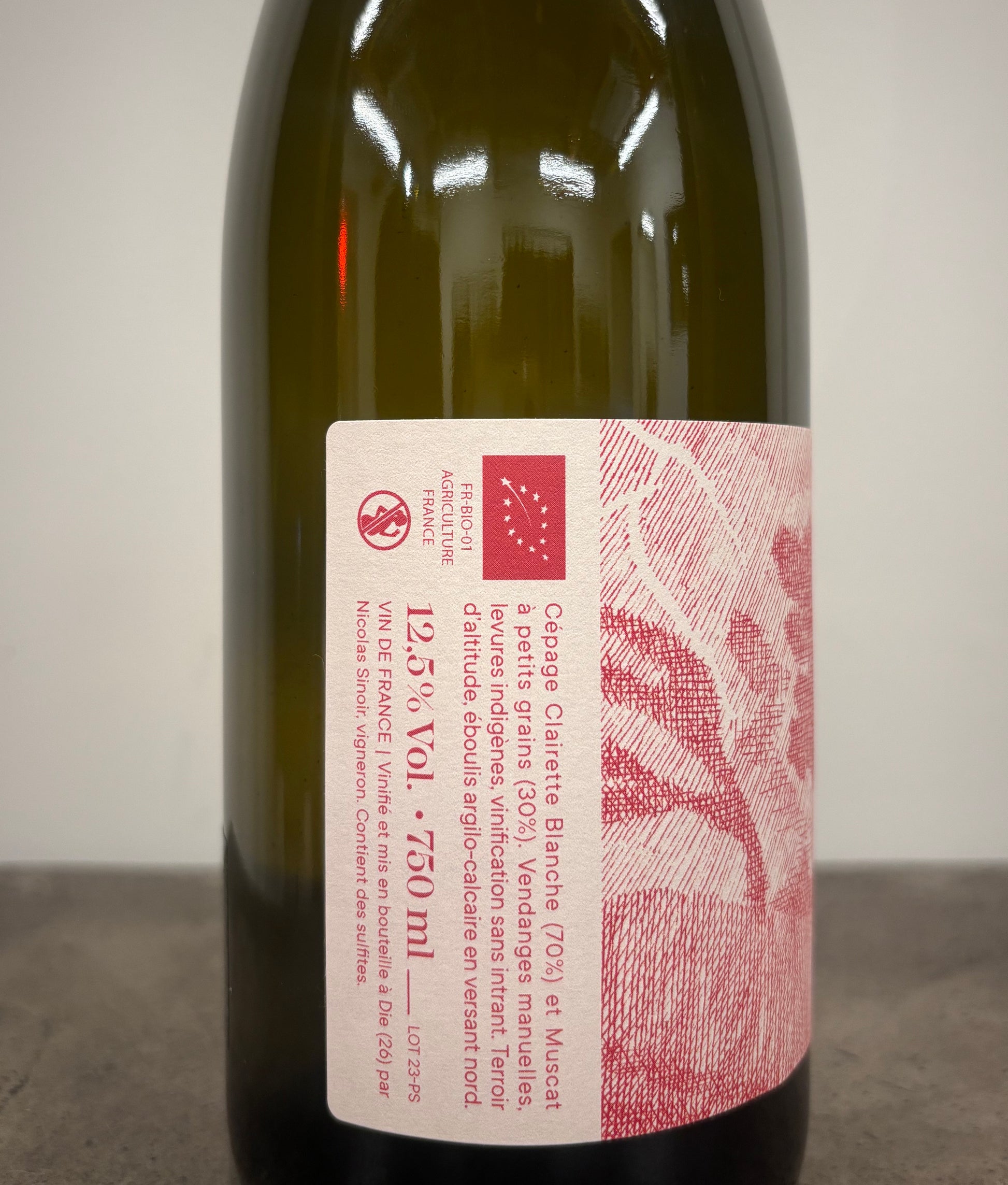 クレレット10/4収穫、ミュスカ9/18-22日収穫収量31ha/hl。ダイレクトプレス後、ファイバータンクで1ヶ月自然発酵、SO2 は発酵終わり20mg/l 添加。10ヶ月熟成後、2024年6月瓶詰。