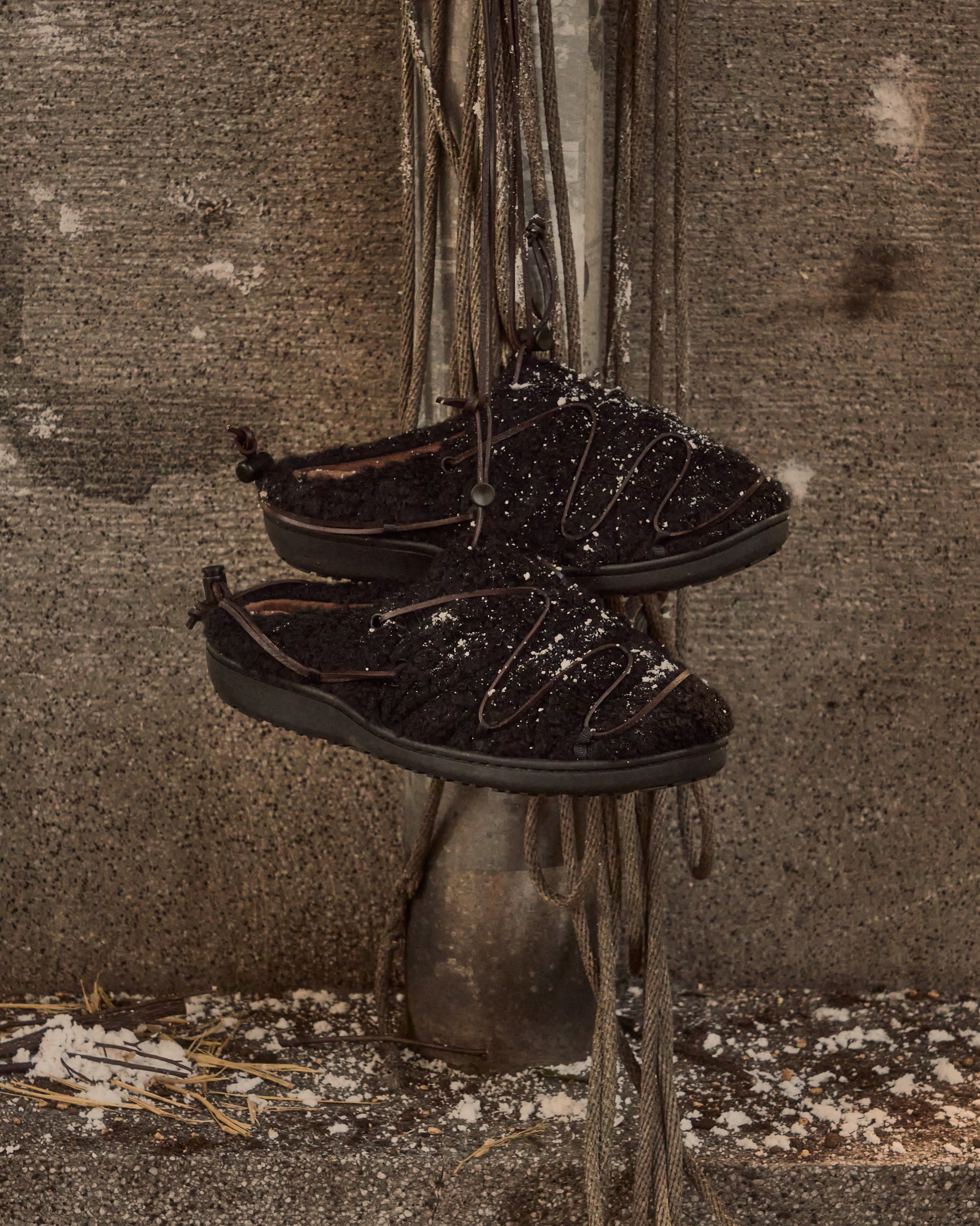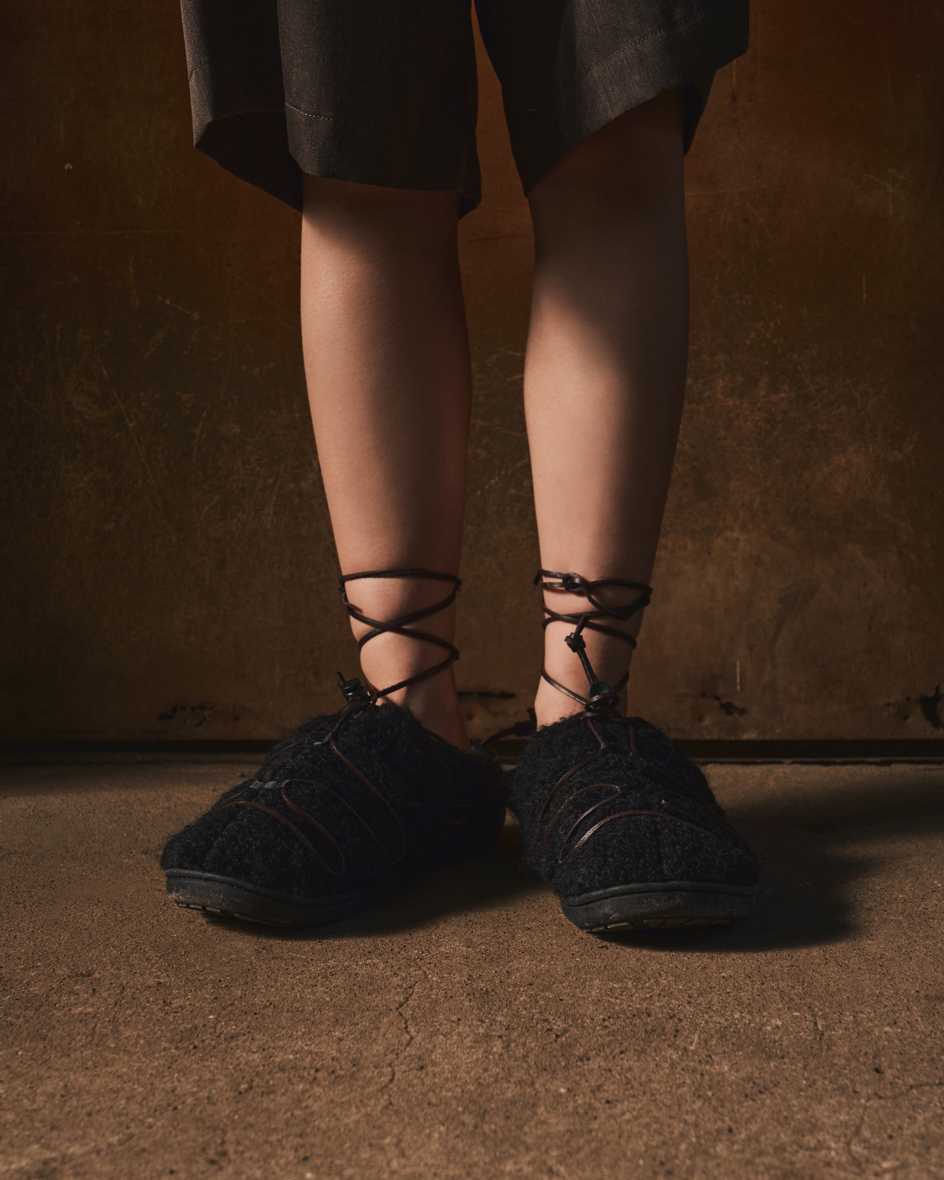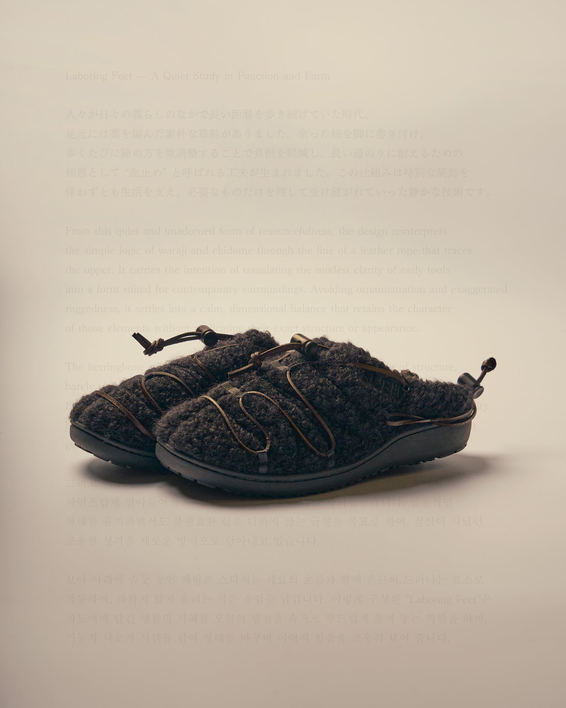 本革のロープを巻き付けたような独自のデザインは、かつて職人たちが、うっ血を防ぎ、長距離を楽に走るために足に巻いた“血止め”から着想。古き知恵を、現代の冬の足元にアクセントとして宿した一足となっています。