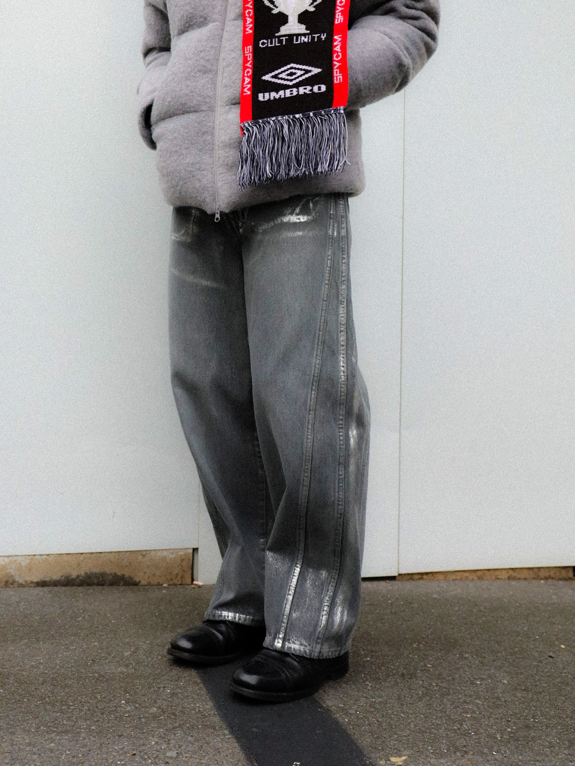 サイドシームが3本配置されたワイドシルエットの6ポケットデニム。