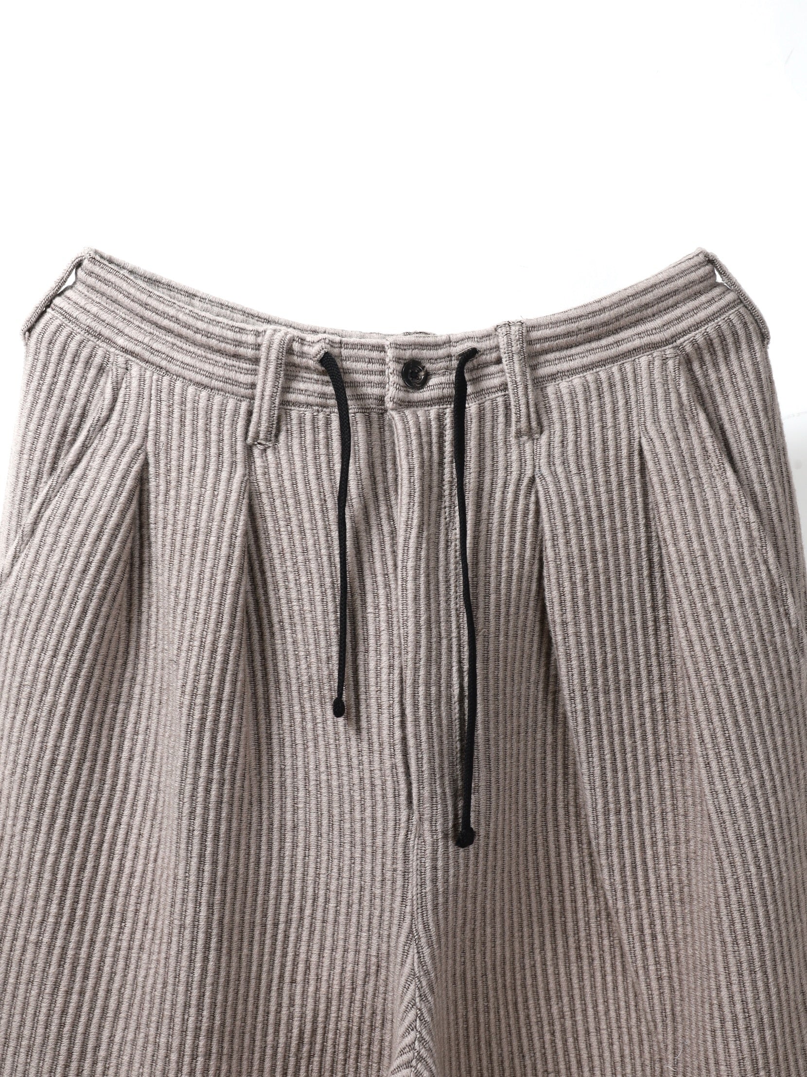 柔らかな履き心地と美しい落ち感を持たせるため織り地ではなく編み地で製作した生地に加工で色を整え暖かなムードを宿しております。