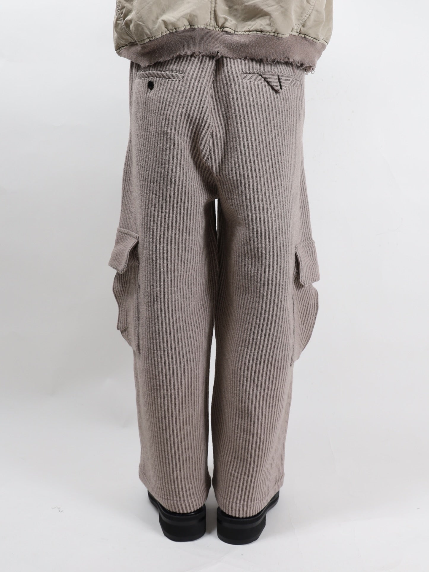 ワークやミリタリー由来のカーゴパンツですがあえてドレスのパターンテクニックを応用し立ち姿の美しさを強調して製作しました。