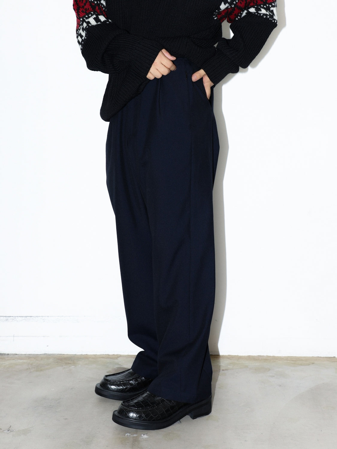 シルエットはワイドストレートのシルエット。 ベルト後にはゴムを配し、ウエストにスピンドルを通すことで様々なサイズ調節が可能。 脇にはコンシールポケットを配し、ワンタックの仕様となっております。 生地には耐久性がありつつ滑らかな生地感で通気性も備えたサージウールを使用。