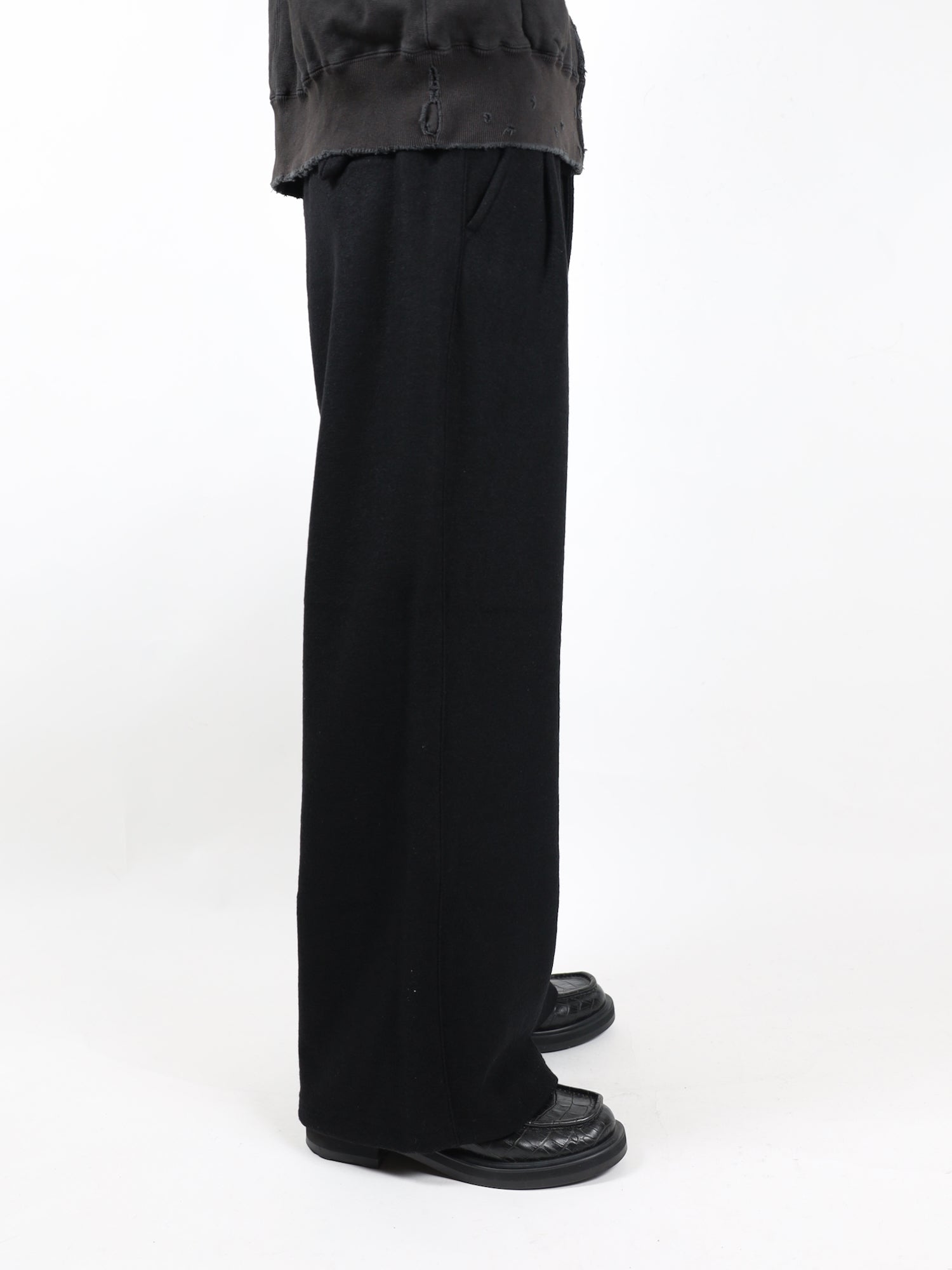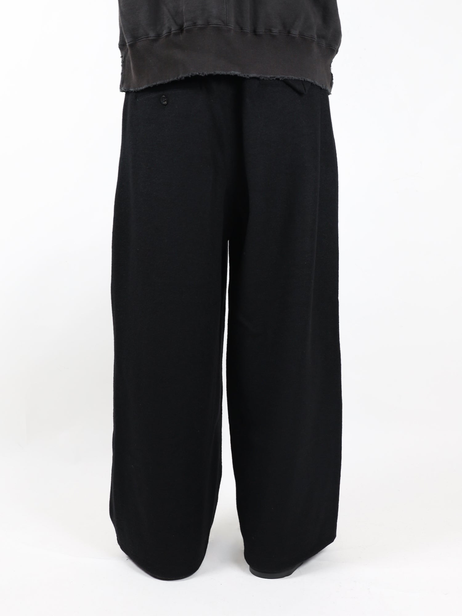 寸法上では非常にワイドな設計ですがフロントにインタックを深めに畳むことで収め、立体を作りながら裾まで綺麗に落ちるようパターンワークで構築しております。