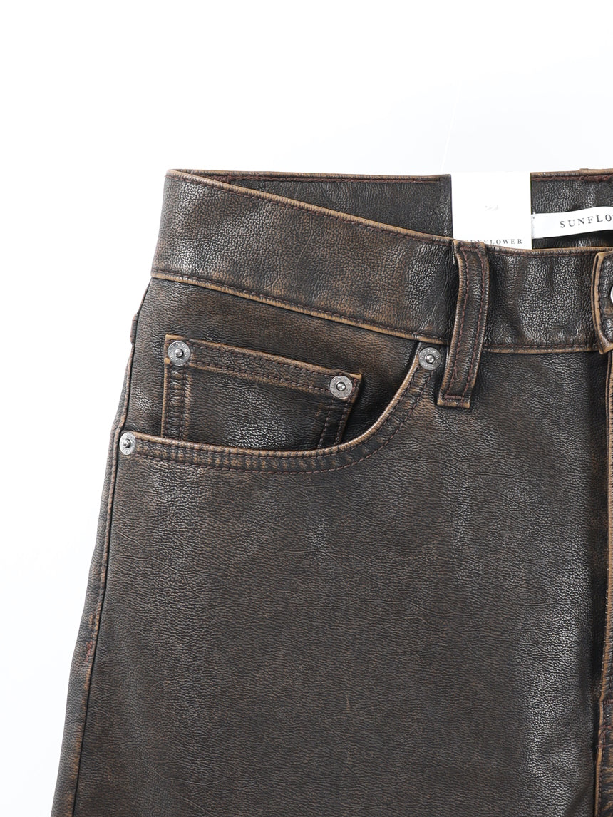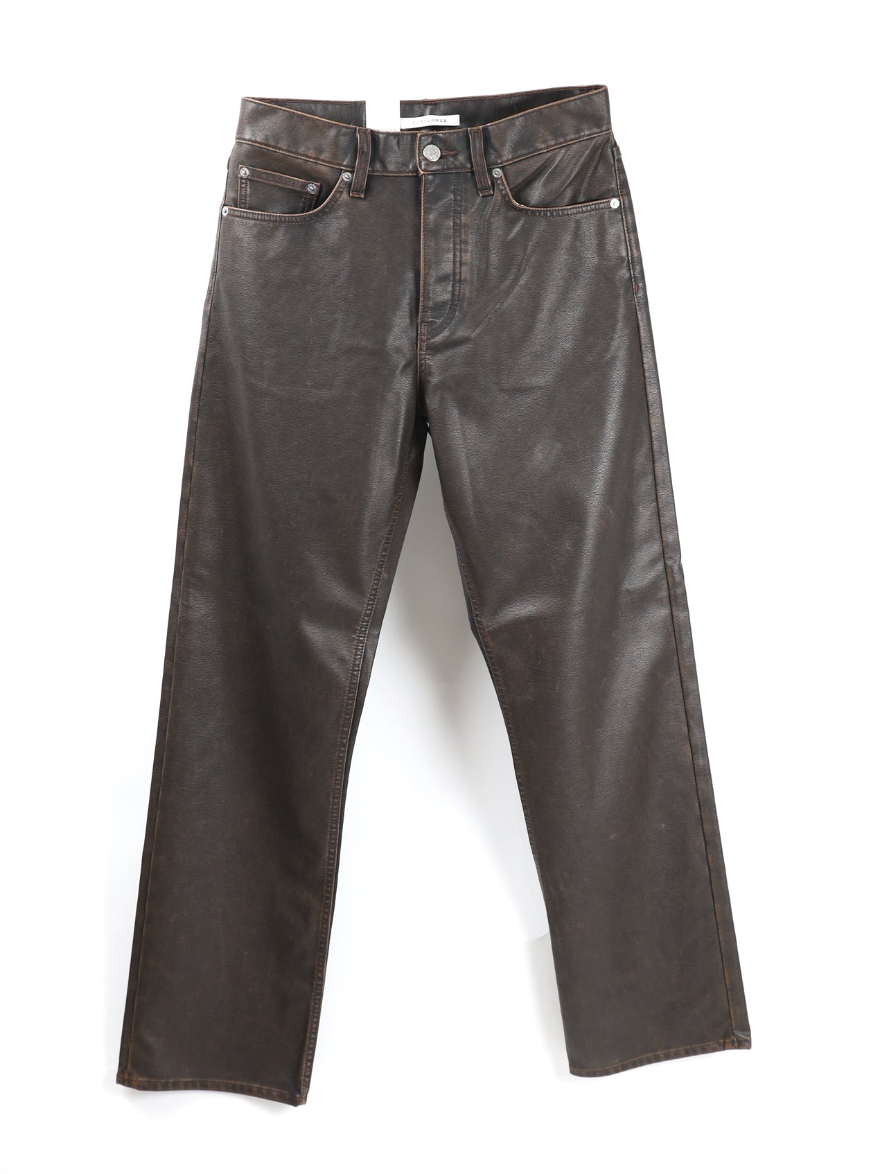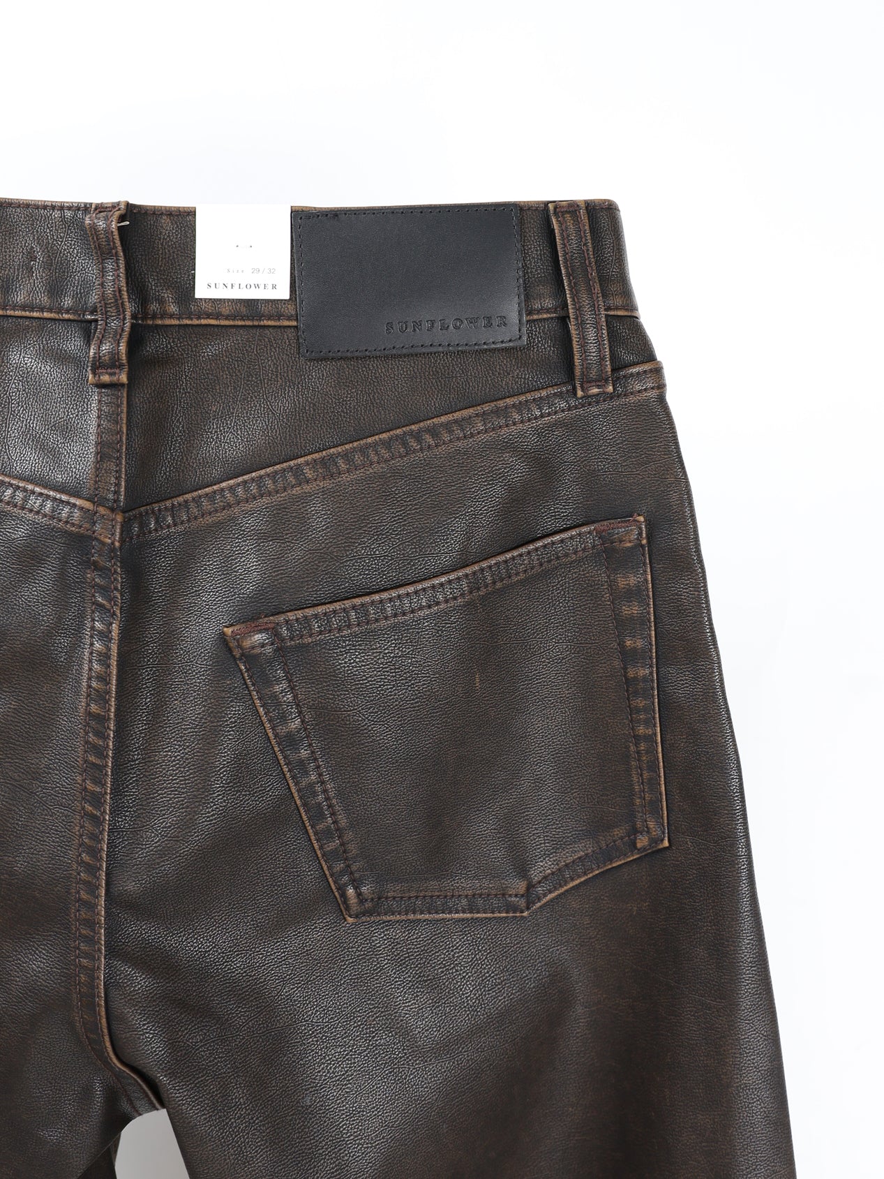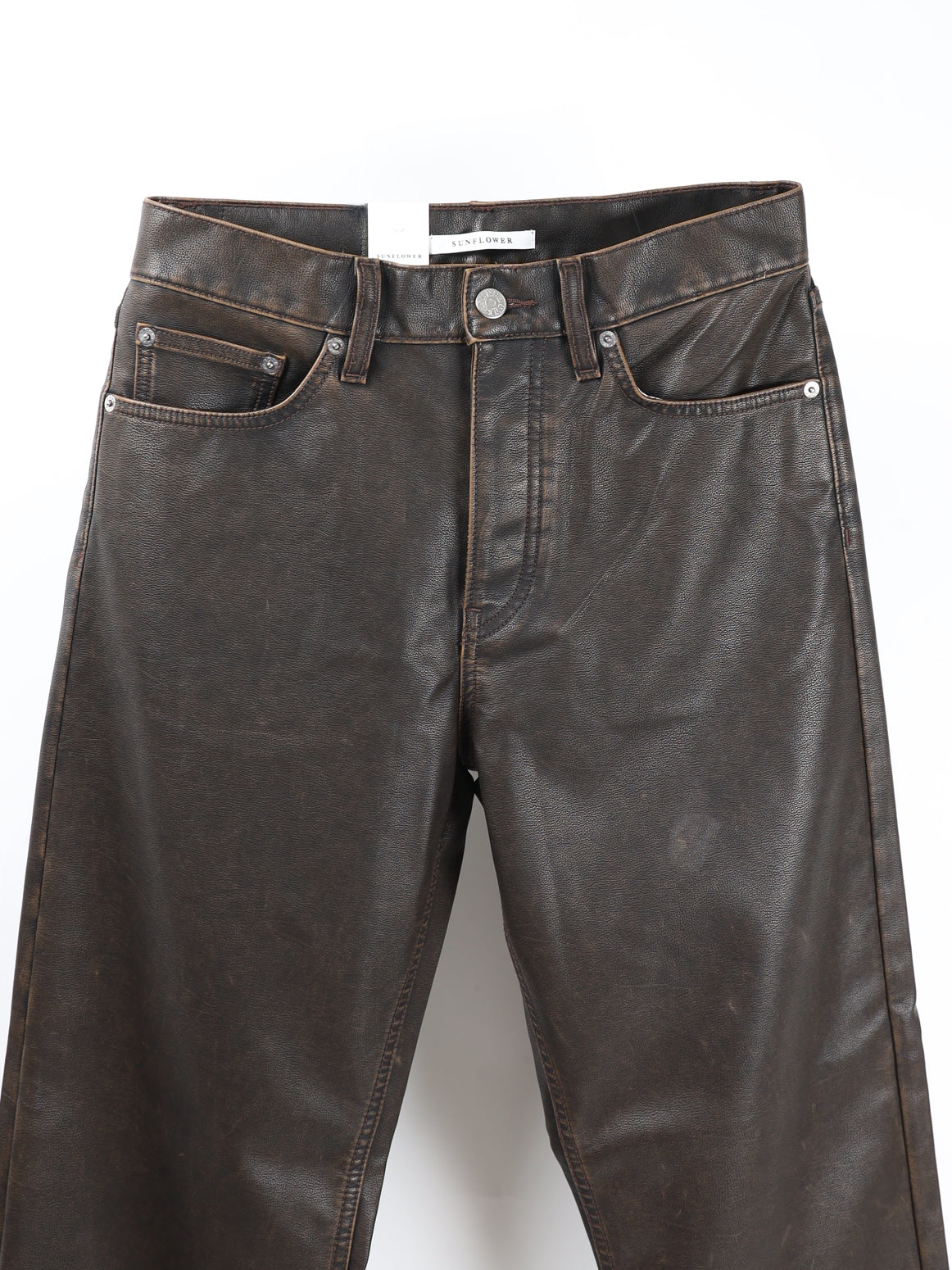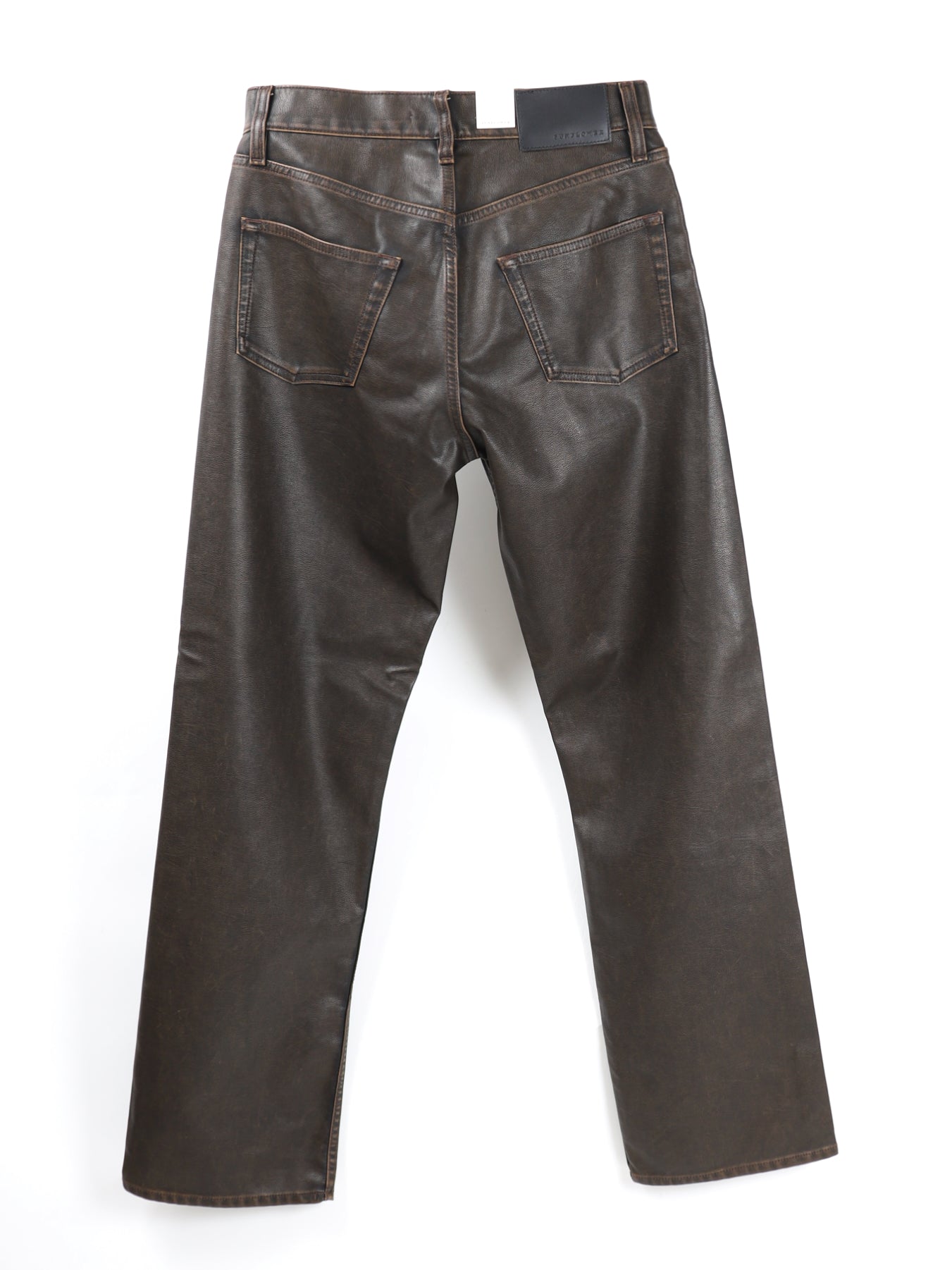 ポリウレタン主体の混紡生地にウォッシュ,コーティング加工を施すことによってレザーのようなシボ感を演出。