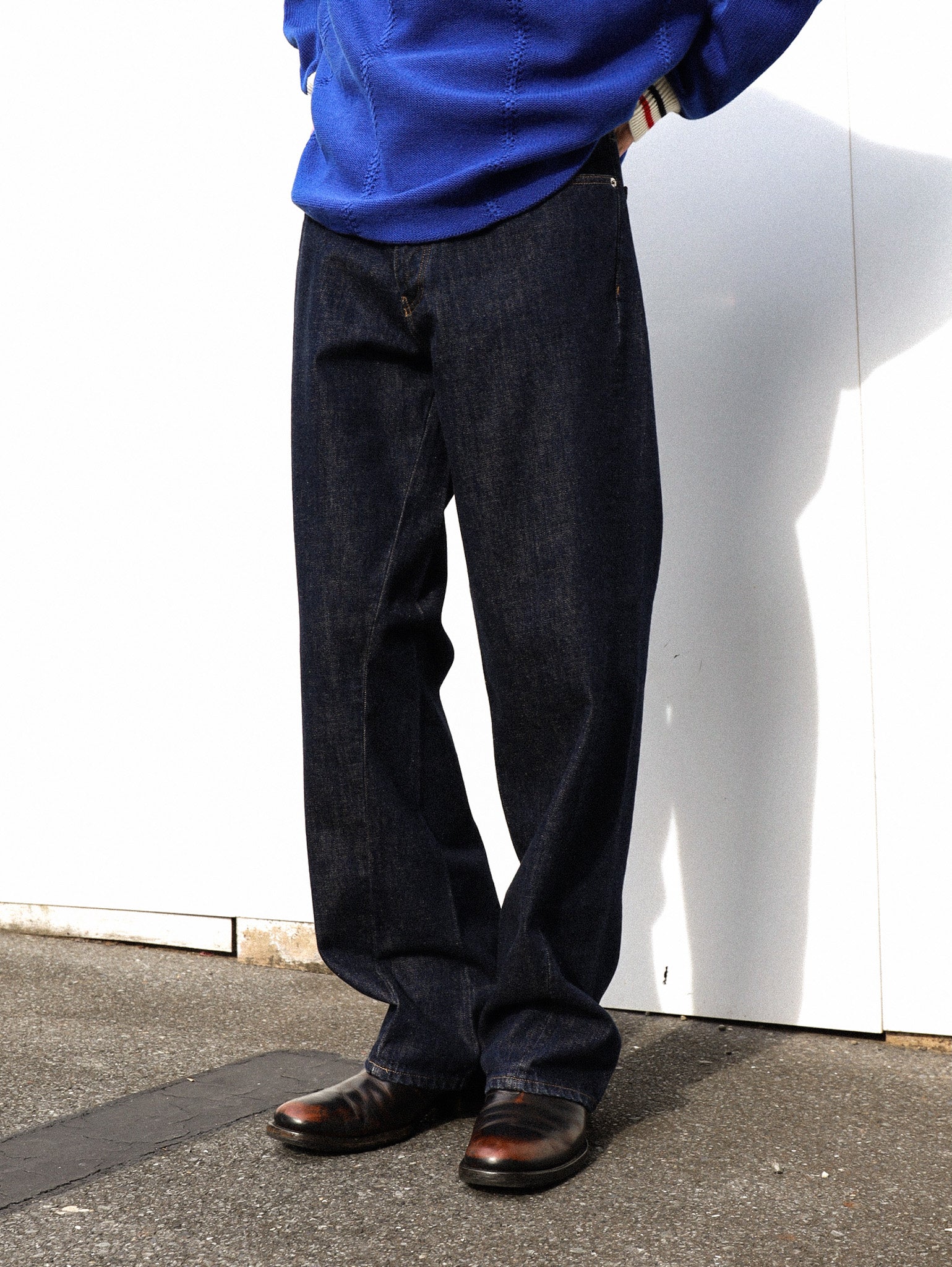 12.5オンスデニムを使用した、ゆったりとしたシルエットのワイドツイストデニムパンツ。